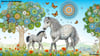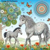 Beautiful white horse & foal with spirograph patterns on green hills scattered with poppies, bluebells & wild flowers. There is a curly tree & butterflies & a spirograph sun.