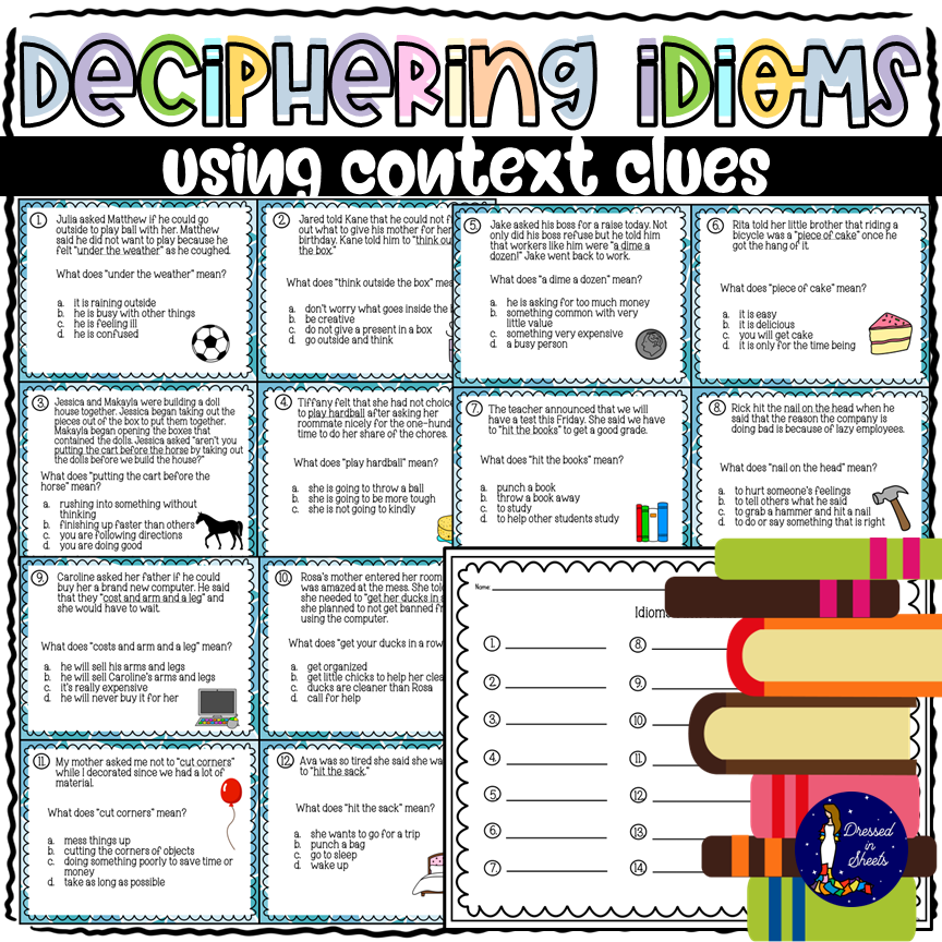 Students will read different situations that give light to famous idioms. By using context clues students will find out what each idiom means.