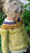 Advanced. A fairly challenging project that requires chart-reading skills and assumes knowledge of stranded knitting worked flat and, while mostly only 2 colours are used per row, some rows use 3 colours at a time. Other stitches you’ll need to know are: cable cast-on, bobble, ribbing and garter. You will also need to know how to do short rows, make buttonholes and finish off by grafting under the arms at the end.