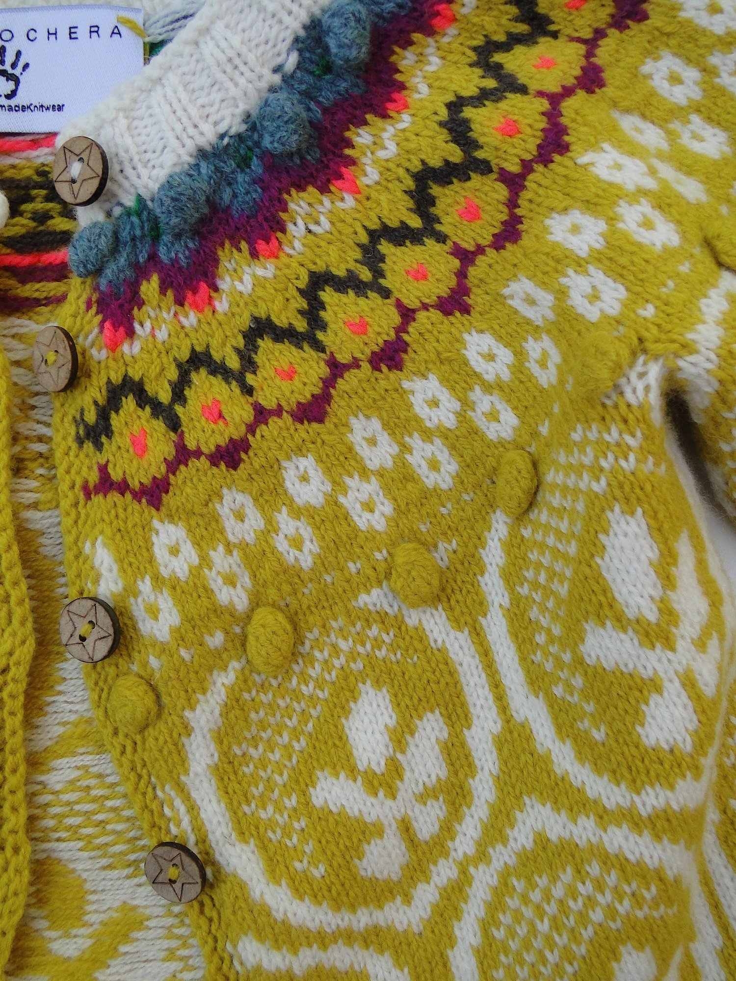 Quince gets its name from its colour (a bright mustard yellow with a slight hint of green), but this cardigan would look great in so many different colour variants. Bobbles around the neckline and cuffs as well as large round motifs, inspired by a 1970s machine-knitting pattern complete the “fruity” equation. It has a vintage look that couldn’t be anything but contemporary!