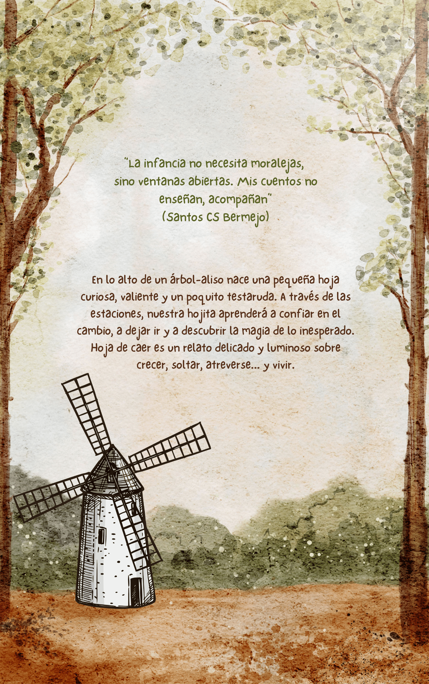 Hoja de caer es un cuento ilustrado que narra la aventura de una pequeña hoja que aprende a soltar, a confiar y a vivir intensamente cada etapa del viaje.