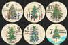 Each bauble design depicts one of the 12 days of Christmas, set around a watercolour Christmas tree. Lots of gold elements.