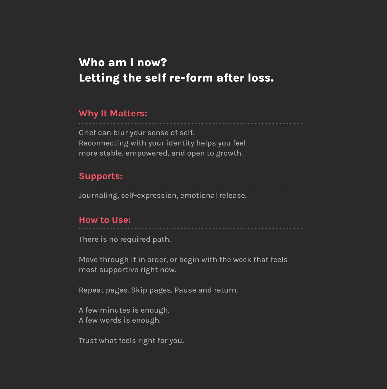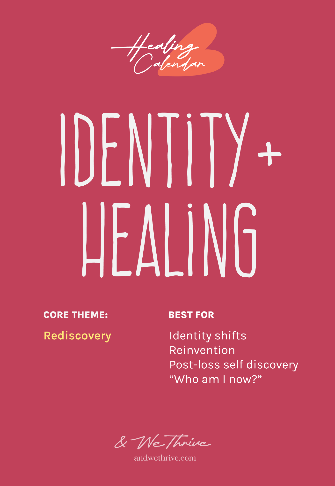 Identity + Healing is a 4-week guided calendar designed to help you gently explore who you are becoming after change, grief, burnout, or major life transitions.
