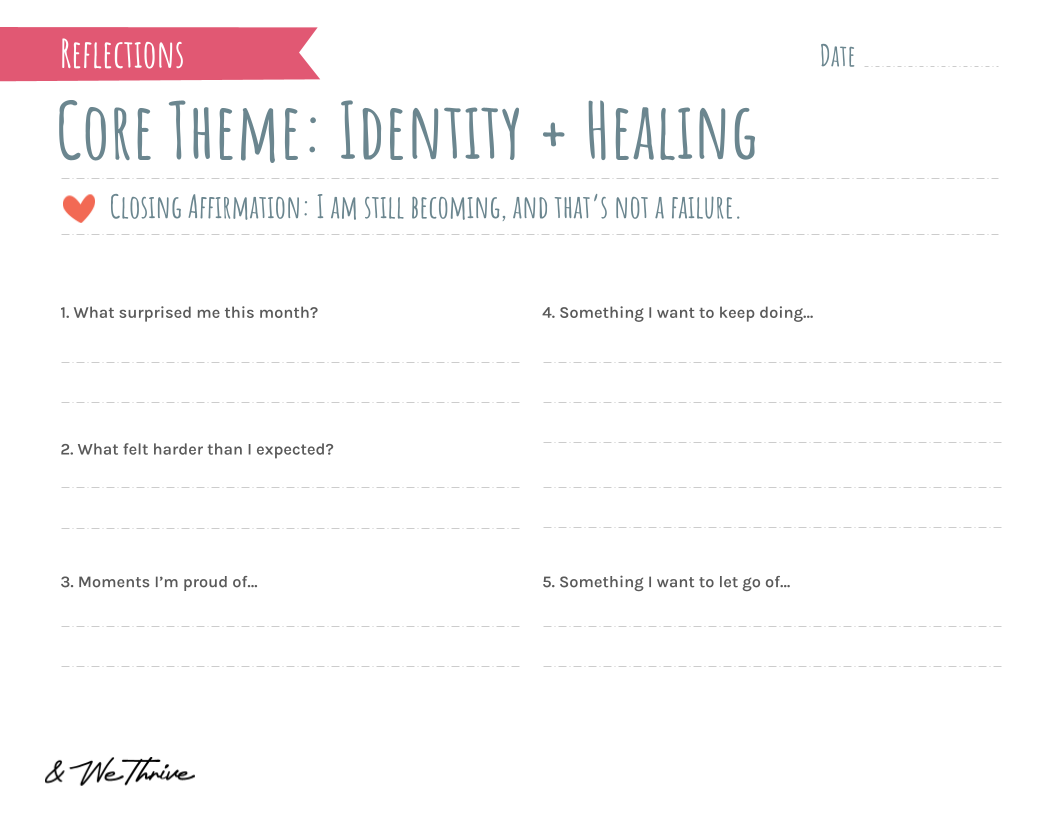 Created as part of the And We Thrive healing series, this calendar approaches identity work with compassion and structure — meeting you where you are, not where you think you “should” be.
