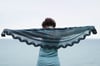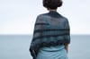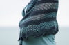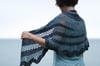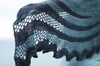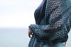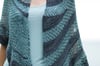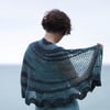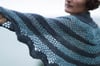 This shawl combines two different stitch patterns to create a fabric that reminds me of rain falling on water. Short row wedges and a wavy edge add to the watery feel, while the double yarn overs in the mesh pattern mimic thousands of raindrops.