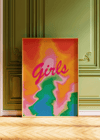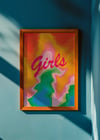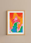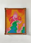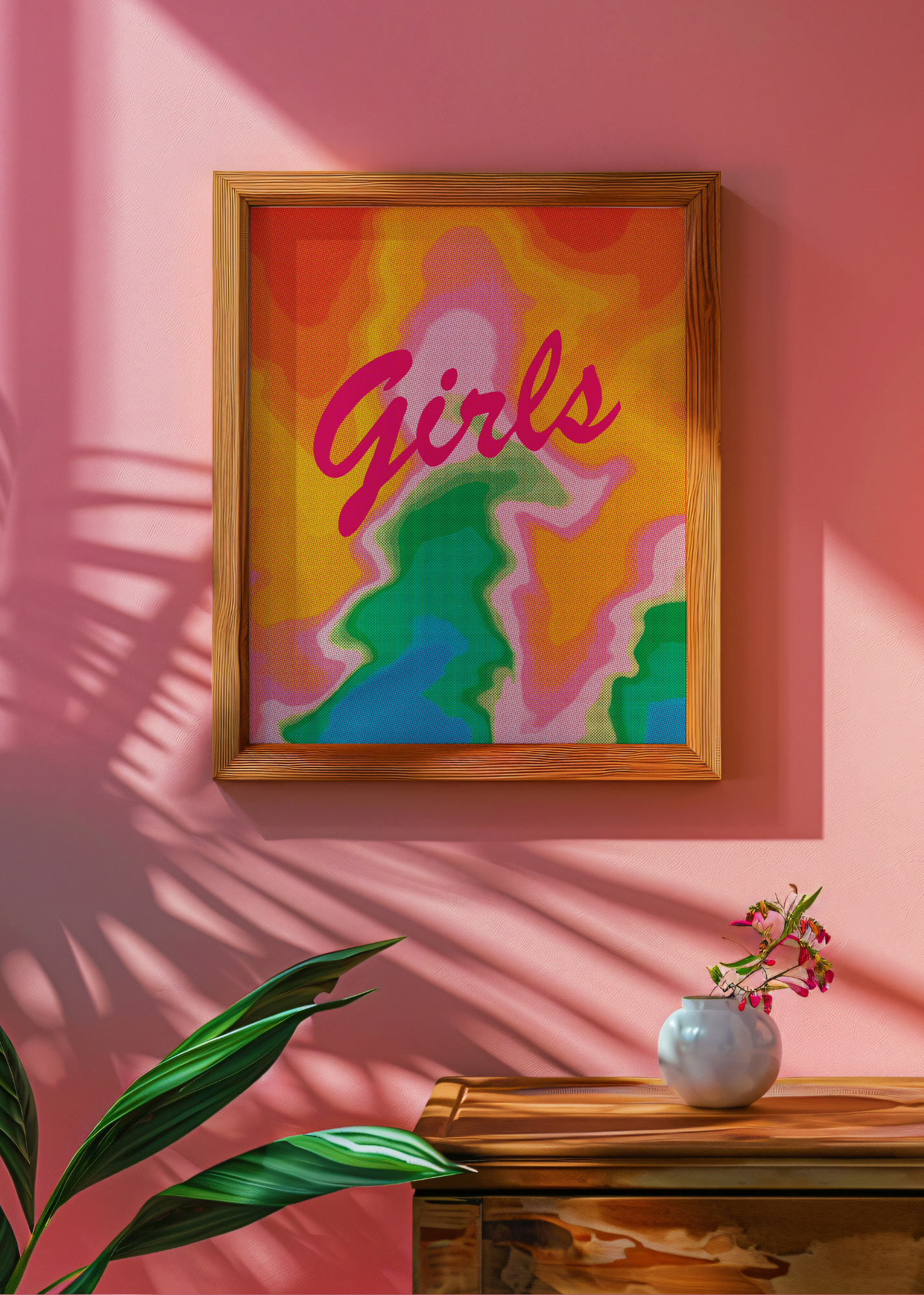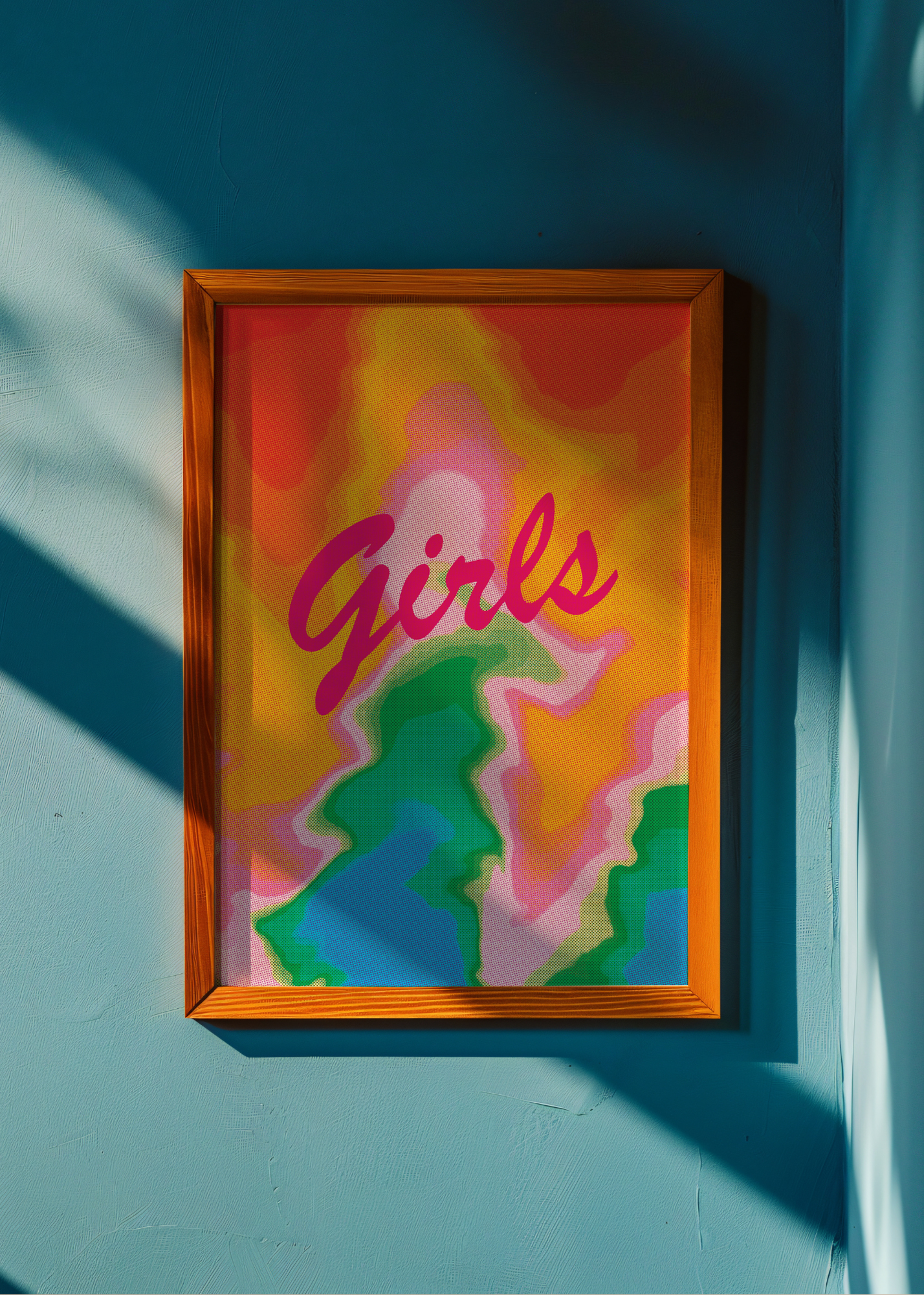 Rainbow Girls— A wavy design of rainbow colors swirls across the background—red, orange, yellow, pinks, greens, blues—blended in bold, joyful movement. Across the center, the word "Girls" is written in bright pink. Loud, proud, and full of girl power.