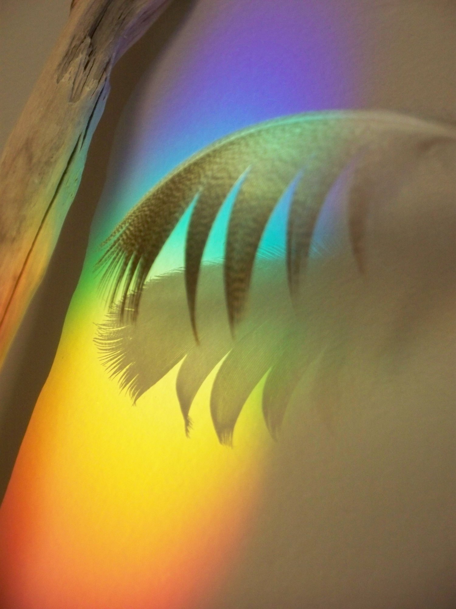 This image was captured in the bedroom in 2011. I had a piece of drift wood leaning against the wall...the rainbow spread along the wood and wall and I placed a feather within the beam and captured what this artist sees as a tranquil palm tree on the beach. Hence I call it "Tranquility"