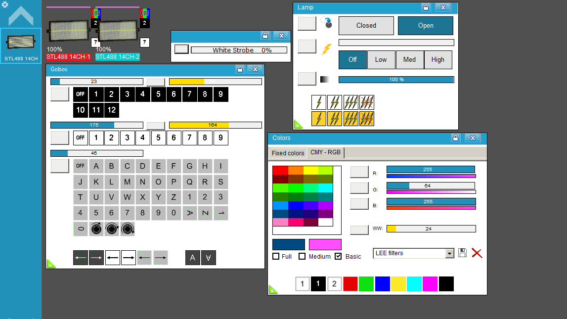 * En el modo CH14 verifique, con un Fixture de pruebas (click), que coincidan estos canales: 1 Dimmer, 11 Rojo, 14 Blanco, 2 Strobo del Rojo, 8 Strobo del Blanco.