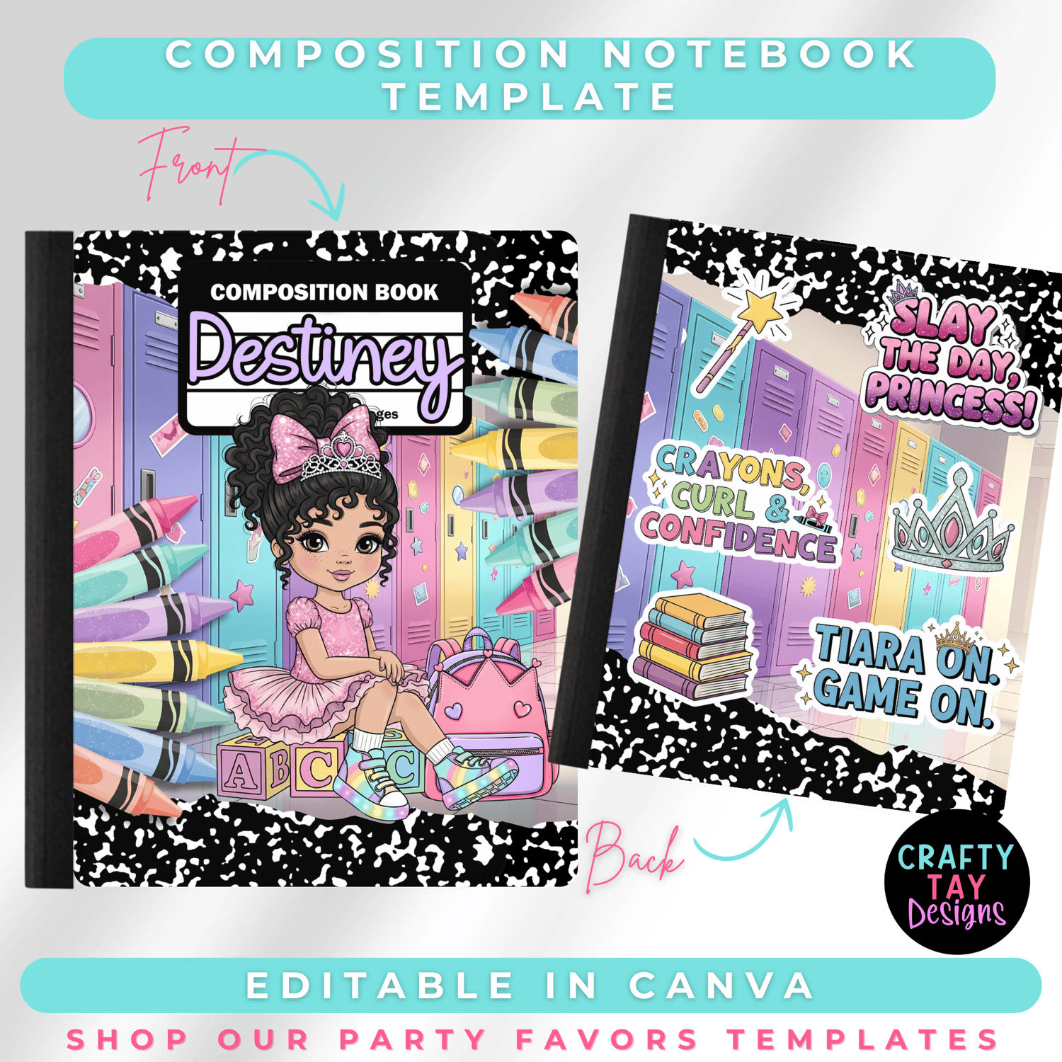 This magical notebook cover template is giving Crayons, Curls & Confidence! Designed for the fabulous little learners who want to rule the classroom in style, this editable Canva file lets you personalize the name and print both the front AND back cover.