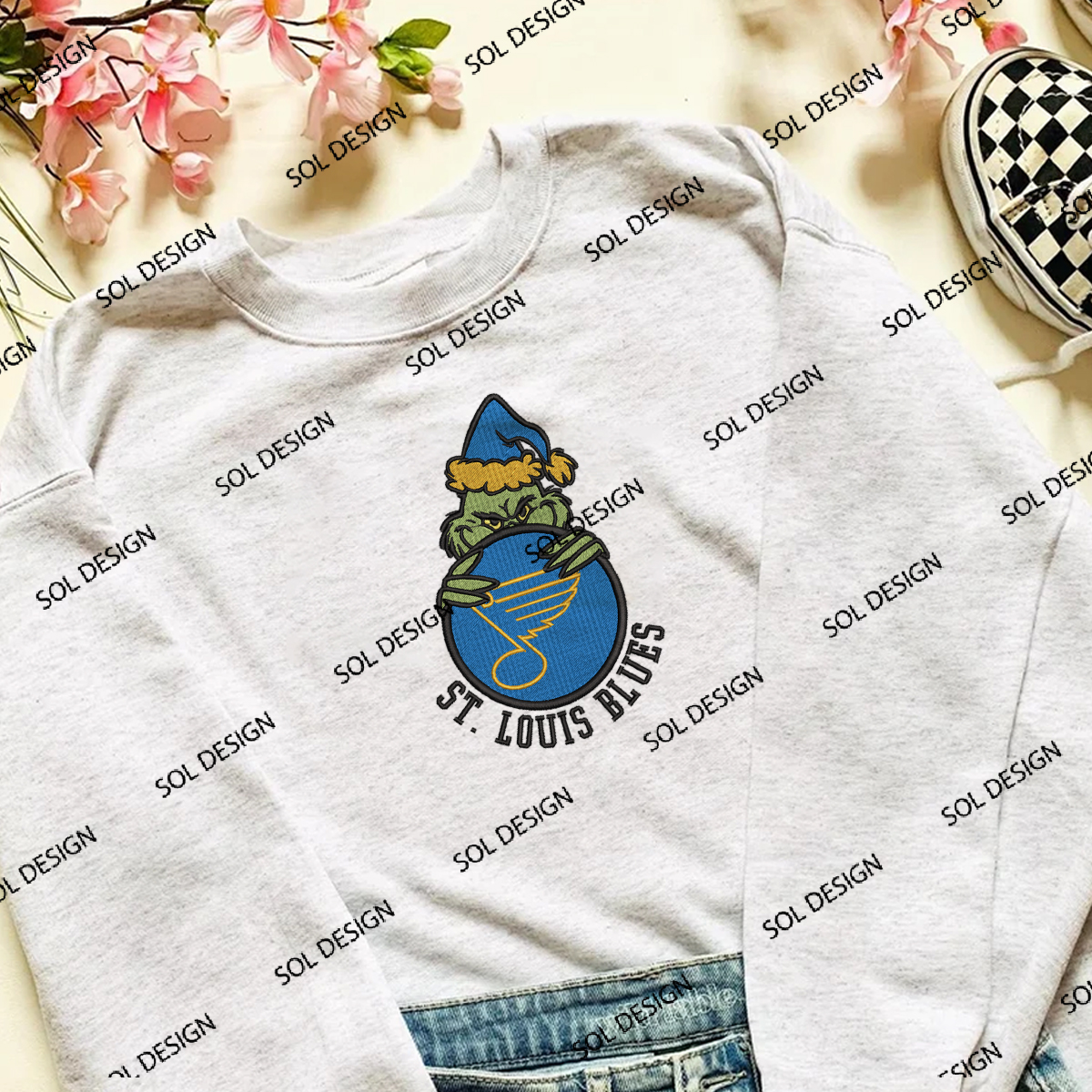 NHL St. Louis Blues Team x Grinch Face Holding Ornament Embroidery Designs, Grinch Embroidery Files, NHL St. Louis Blues Hockey Team Logo Embroidery, Christmas Machine Embroidery Design, Digital Download