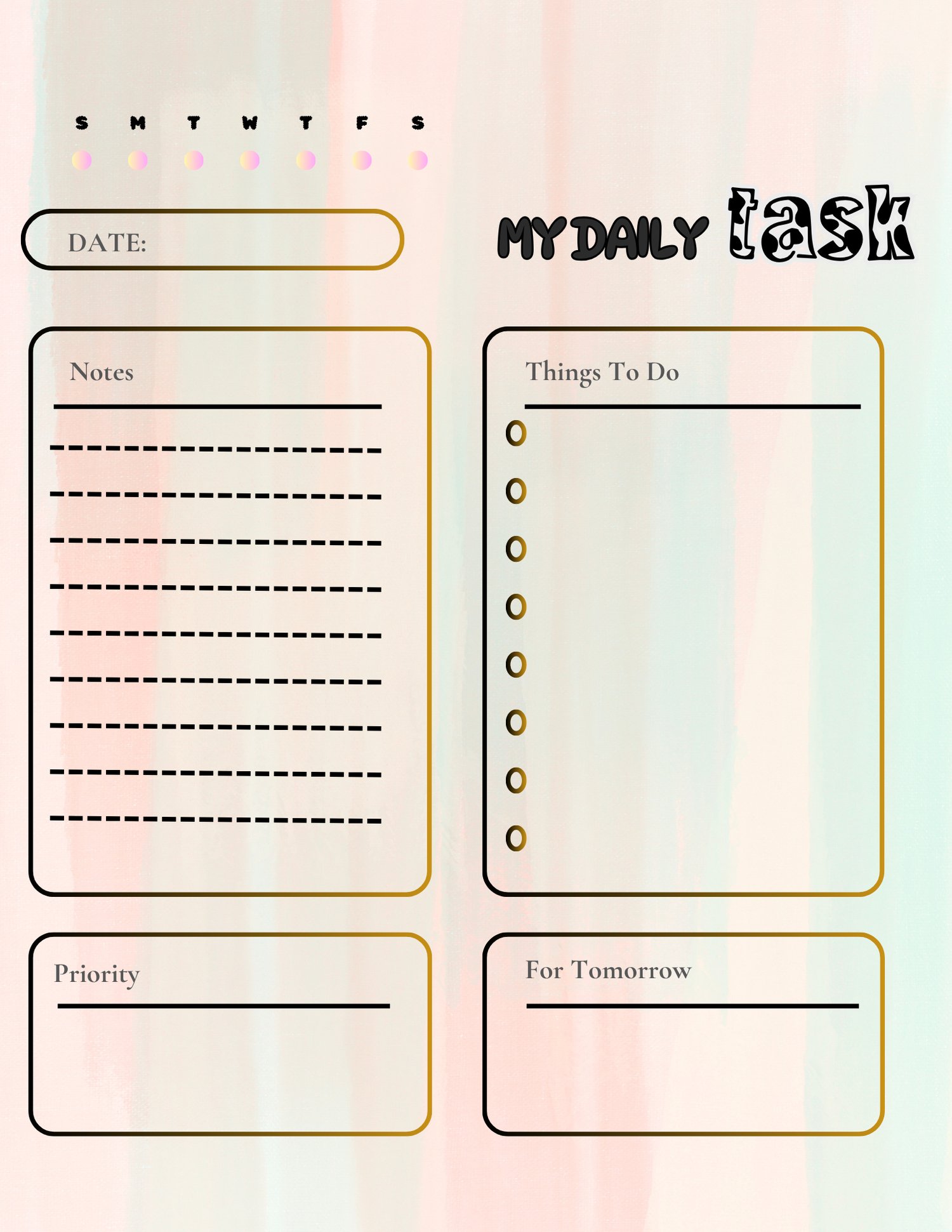 Use this uniquely designed digital diary to start and end your day with purpose. It helps you organize and structure your day, day by day, and track your activity for a week, whether you're jotting down your thoughts, tracking your mood, or setting goals. It's ideal for personal growth, mindfulness, and daily planning. It's also easy to print for those who prefer writing.