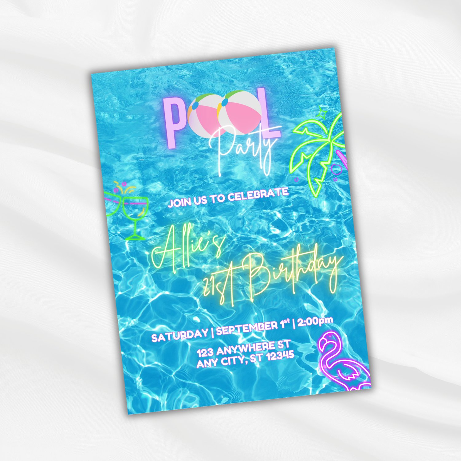 Make a splash with this fun and vibrant neon pool party invitation template! Perfect for summer birthdays, backyard celebrations, or any tropical-themed party, this digital design is sure to get your guests excited.