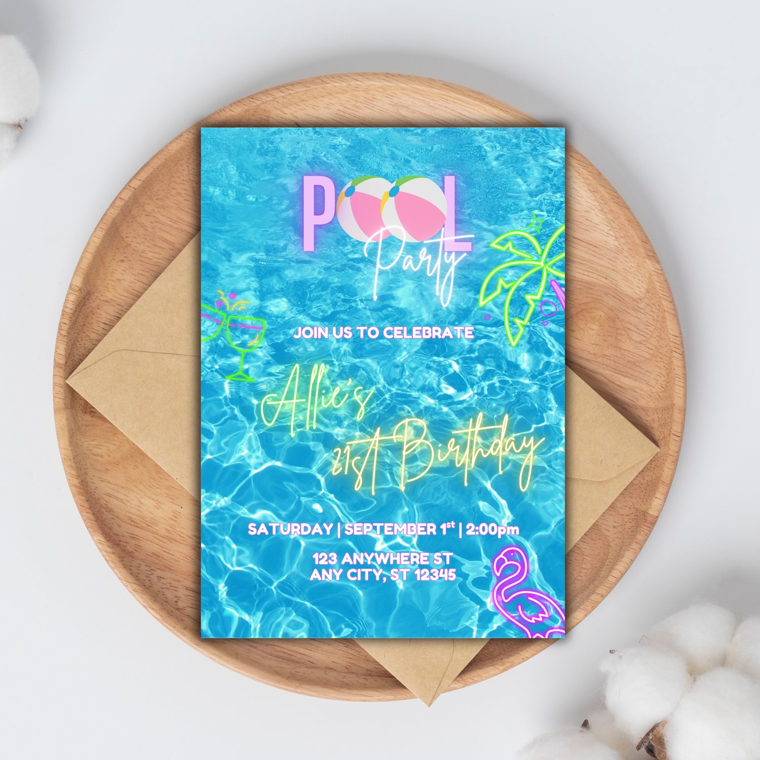 With bright neon accents, playful tropical elements, and a refreshing poolside background, this invite sets the tone for an unforgettable event. Best of all—you can easily customize all the text in Canva to fit your celebration!