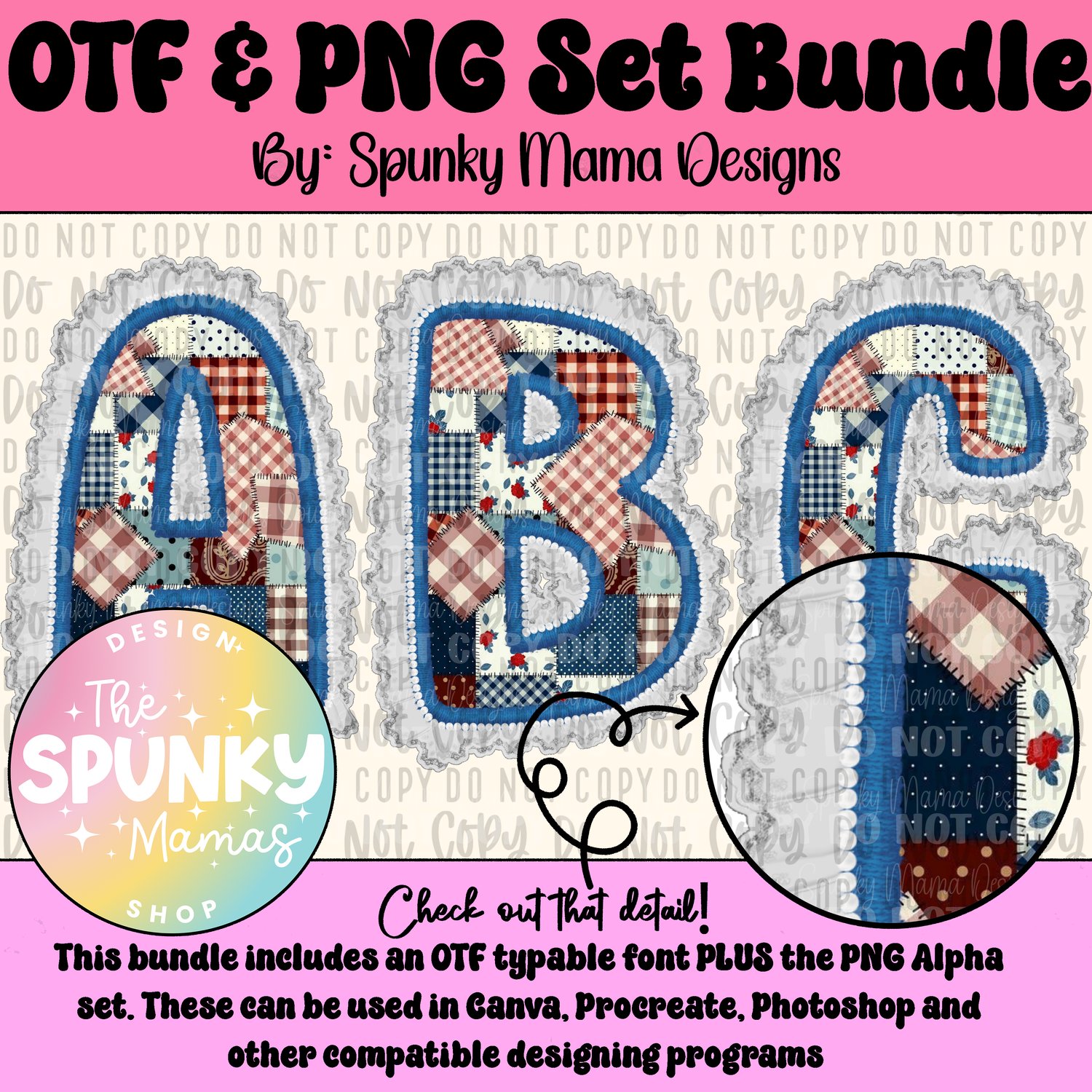 Blue Patchwork Lace OTF Font & Digital PNG Alpha Set