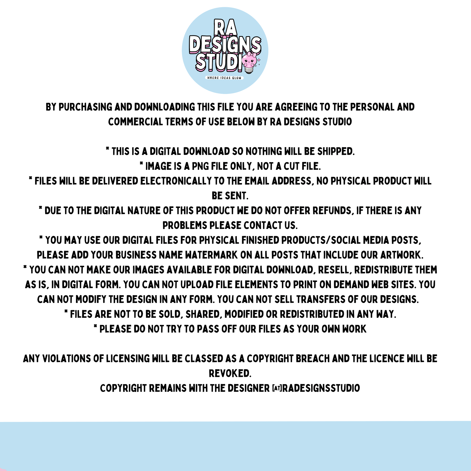 By purchasing and downloading this file you are agreeing to the personal and commercial terms of use below by RA Designs Studio By purchasing and downloading this file you are agreeing to the personal and commercial terms of use below by RA Designs * This is a digital download so nothing will be shipped.* Image is a PNG file only, NOT a cut file.* Files will be delivered electronically to the email address, no physical product will be sent.* Due to the digital nature of this product we do not offer refunds, if there is any problems please contact us.* You may use our digital files for physical finished products. Such as prints, mugs, hoodies etc* You can NOT make our images available for digital download, resell, redistribute them as is, in digital form. You can NOT upload file elements to print on demand web sites. You can NOT modify the design in any form. You can NOT sell transfers of our designs. You can* Files are not to be sold, shared, modified or redistributed in any way.* Please do NOT try to pass off our files as your own work Any violations of licensing will be classed as a copyright breach and the licence will be revoked.