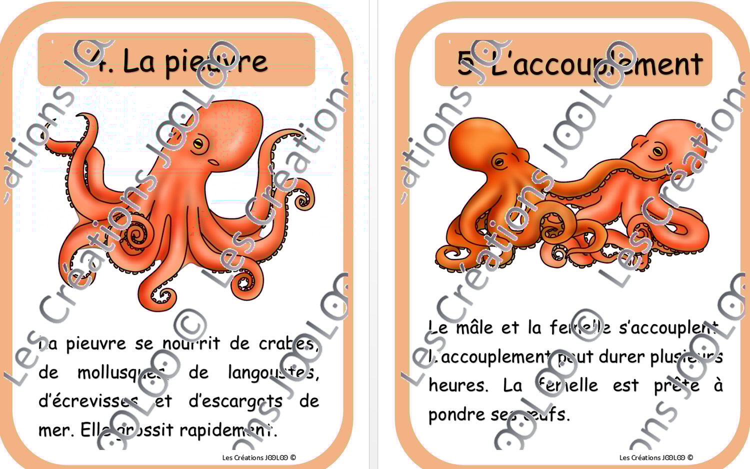 - 2 fiches sur le cycle de vie de la pieuvre (1 modèle, 1 élève)