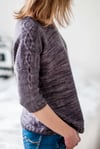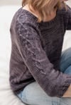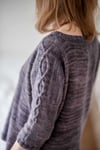 The cable pattern is contiguous, beginning from shoulder, continuing on the sleeve and then vanishing. The sweater is worked seamlessly from top down, upper body back and forth and rest of the sweater in the round. Cables have both charts and written instructions. The pattern also includes a construction schematic.