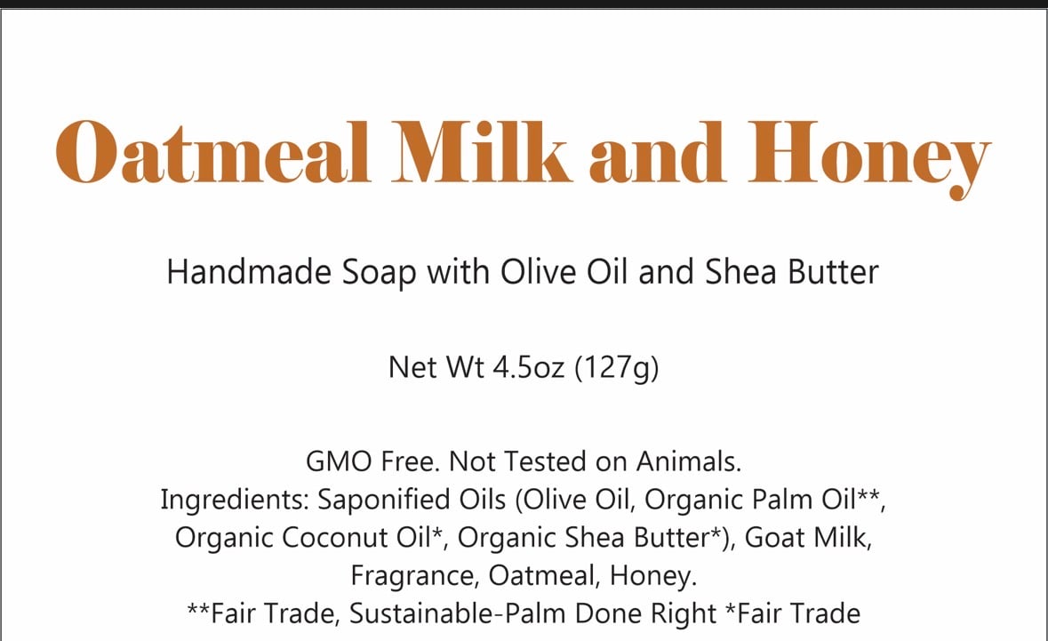 Ingredients: Saponified Oils (Olive Oil, Organic Palm Oil**, Organic Coconut Oil*, Organic Shea Butter*), Fragrance, Oatmeal, Honey. **Fair Trade, Sustainable-Palm Done Right, *Fair Trade