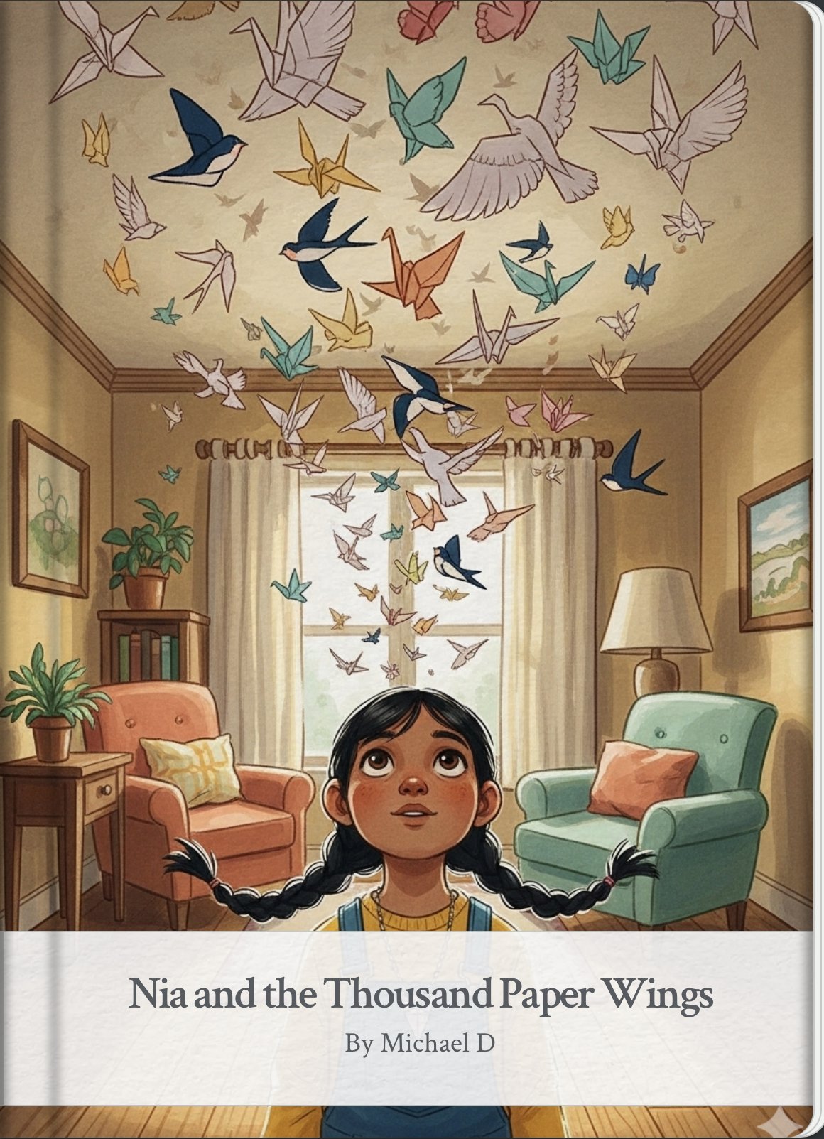 A young girl named Nia processes her grief over her grandfather's death by folding one thousand paper cranes, a task he suggested in a final note. With the help of her friends, Nia transforms her living room into a sea of paper wings, each one a folded memory. When the last crane is folded, the paper creations take flight, carrying Nia's message of love and loss into the world. Though her grandfather doesn't return, Nia finds peace and a way to keep his memory alive, teaching others to fold their own wishes into the wind.