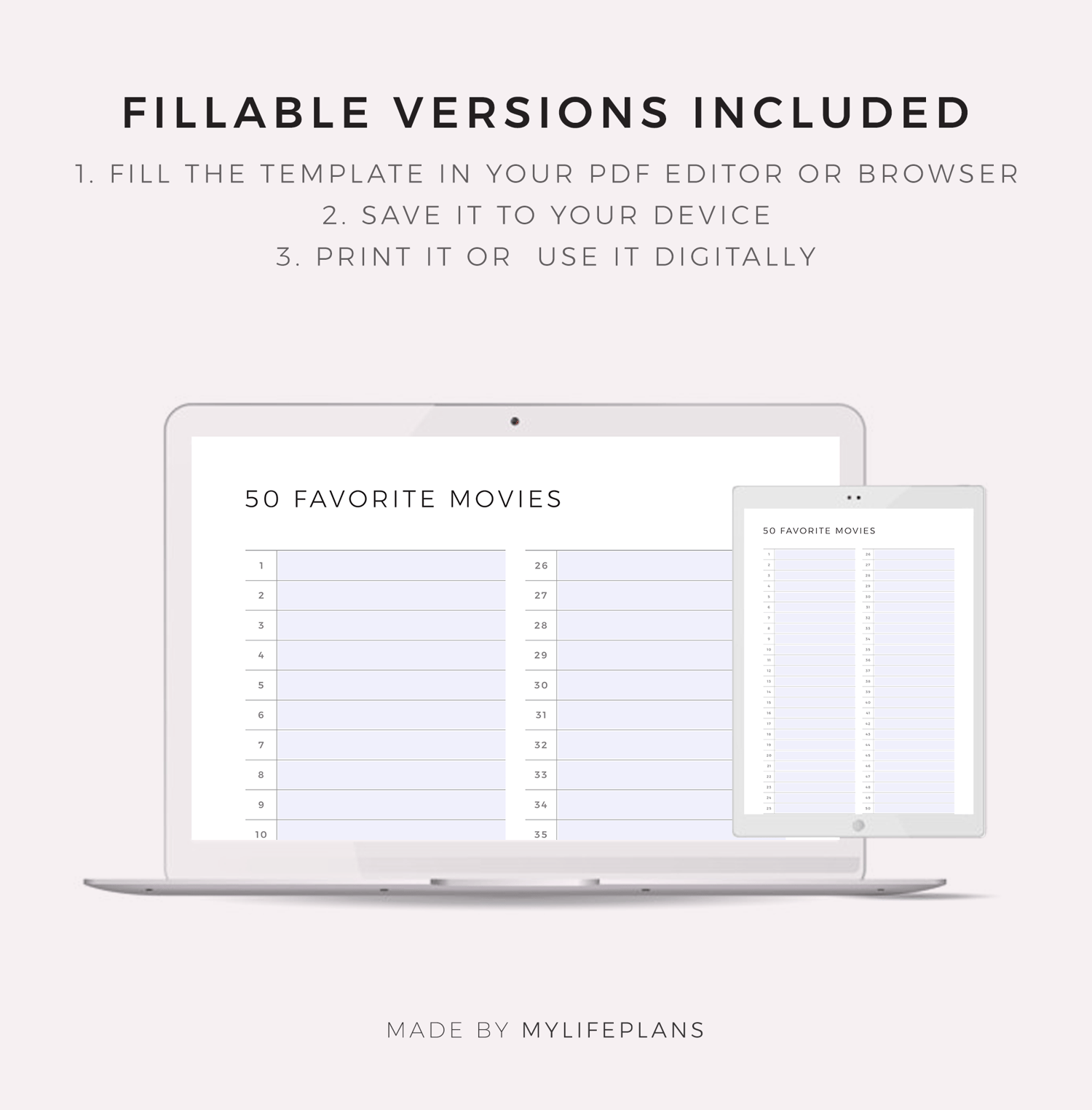 My Favorite Movies List, Best Movies I've Watched, Movie Ranking, Printable, A4/Letter