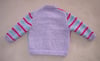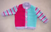 This 8ply/DK babies cardigan is worked in three colours. Very easy to knit, it has a round neck, set in sleeves and 1x1 rib bands. It is photographed in size 3 months.