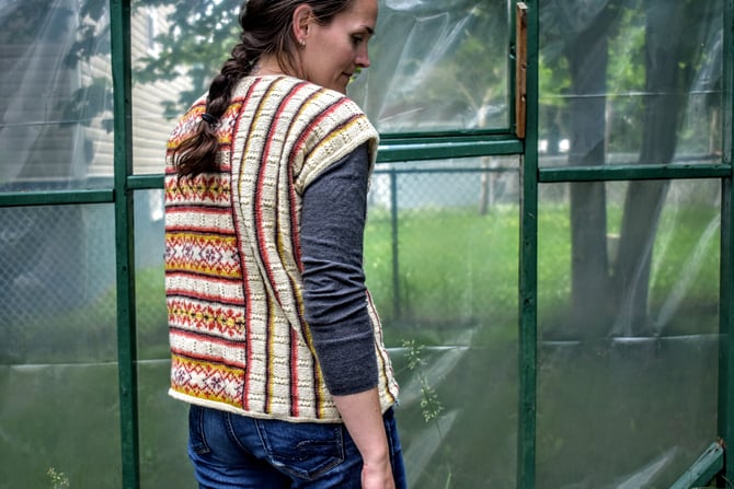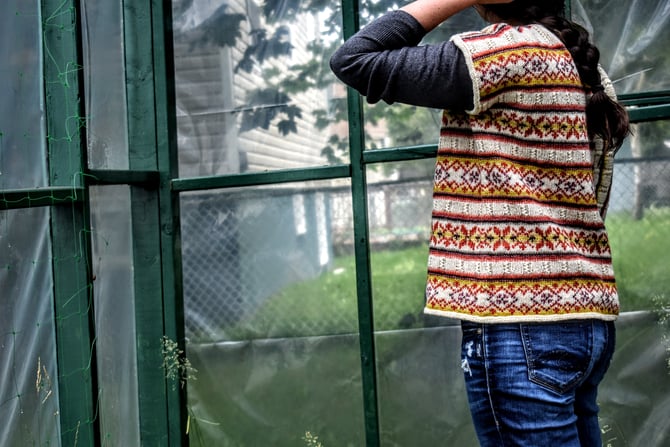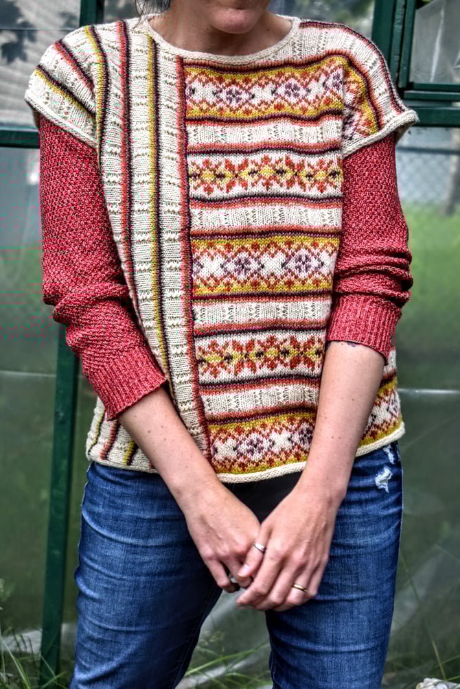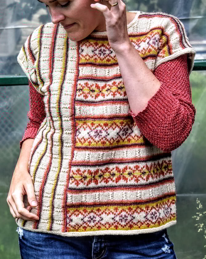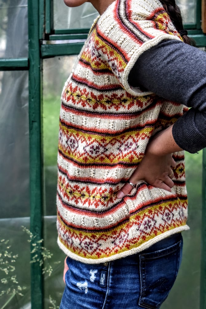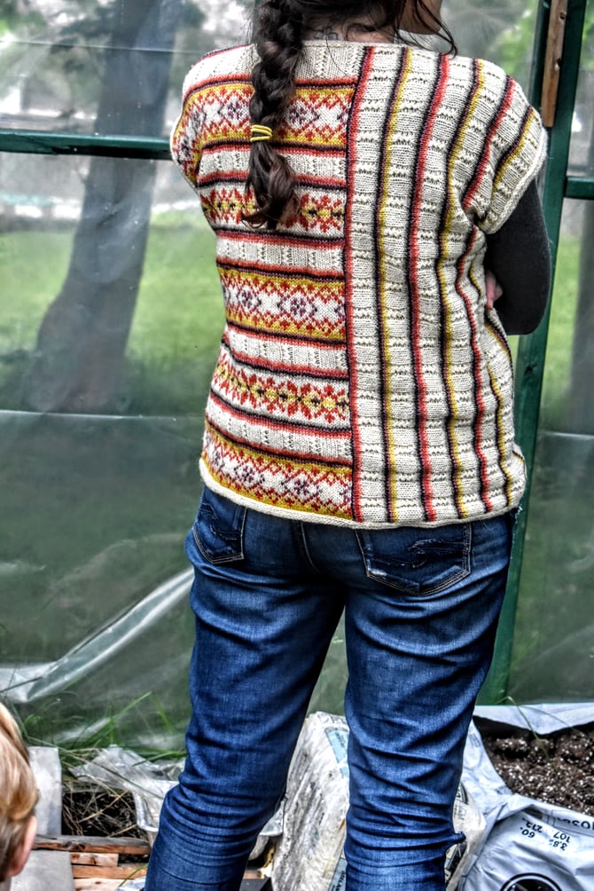 A collaboration with Hey Mama Wolf Yarns and Moeke Yarns for the MY Make Along 2019! Pippy Park is a sleeveless and asymmetrical layering top. The stranded colourwork is knit in the round and steeked; the striped and textured portion is knit sideways and flat. The essence of the sweater derives from Pippi Longstocking (a fictional character) and Pippy Park (Canada’s largest provincial park in an urban setting and is well known for its many recreational activities). The zig zag texture pattern embodies the popular snowshoeing trails in Pippy Park.