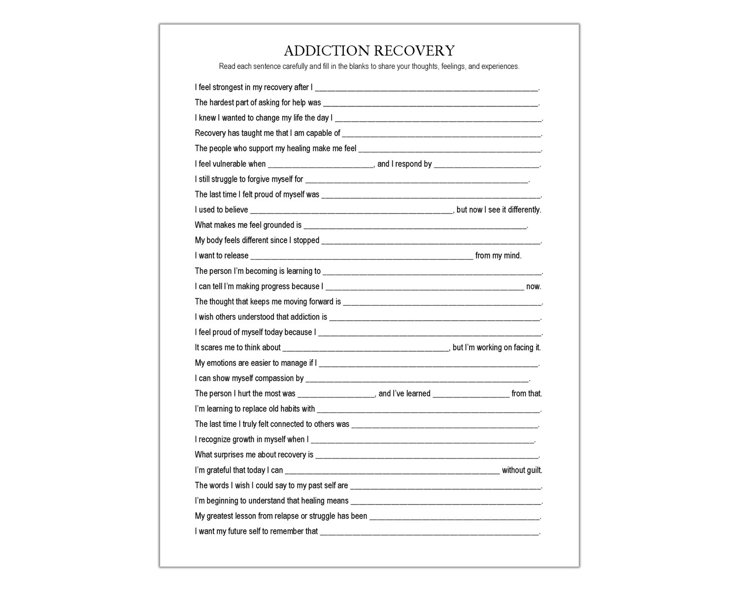 Move forward in recovery one day at a time with this Addiction Recovery worksheet. This resource features 30 prompts to support you through reflection, self-compassion, and mindful steps toward a healthier mindset. Work through it at your own pace and recognize the strength you carry each day. It helps you see how far you’ve come.