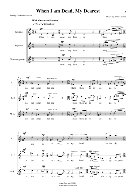 Despite the themes of love, death and despair, I find an inherent beauty in these lyrics, and find the language Rossetti uses particularly feminine, strong and evocative. I have used both church modes and exotic modes to match the mood changes within the text, reflecting the narrator’s changing state of mind from light to dark, from hope to melancholy.