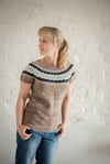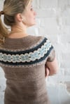 Piece is worked seamlessly from the top down. The back neck is shaped by working back and forth using short-rows. After the neck shaping, the Yoke is worked in the round, increasing stitches every few rounds while the Fair Isle pattern is worked, and then ending with several rounds of raglan increases. When the yoke is complete, the Sleeves and Body are divided and the Sleeves are placed on hold while the Body is worked to the bottom edge. Then the Sleeves are worked to the cuff.