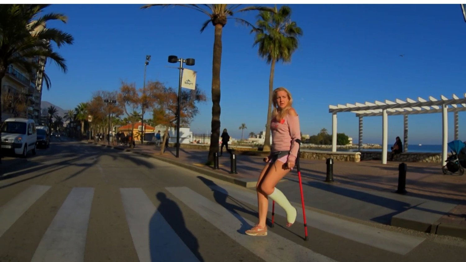 Alva is out crutching in Spain and she jumps across the street with her left leg in SLC.