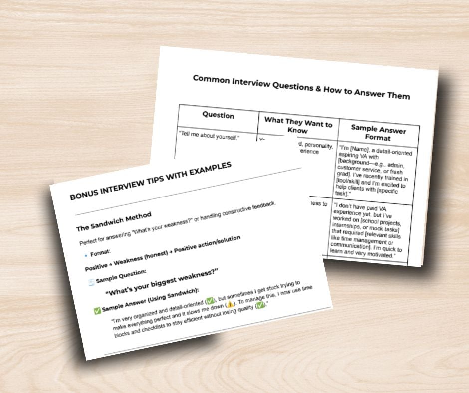 - Proven answers to the most common VA interview questions (like “Tell me about yourself” or “Do you have experience?”)