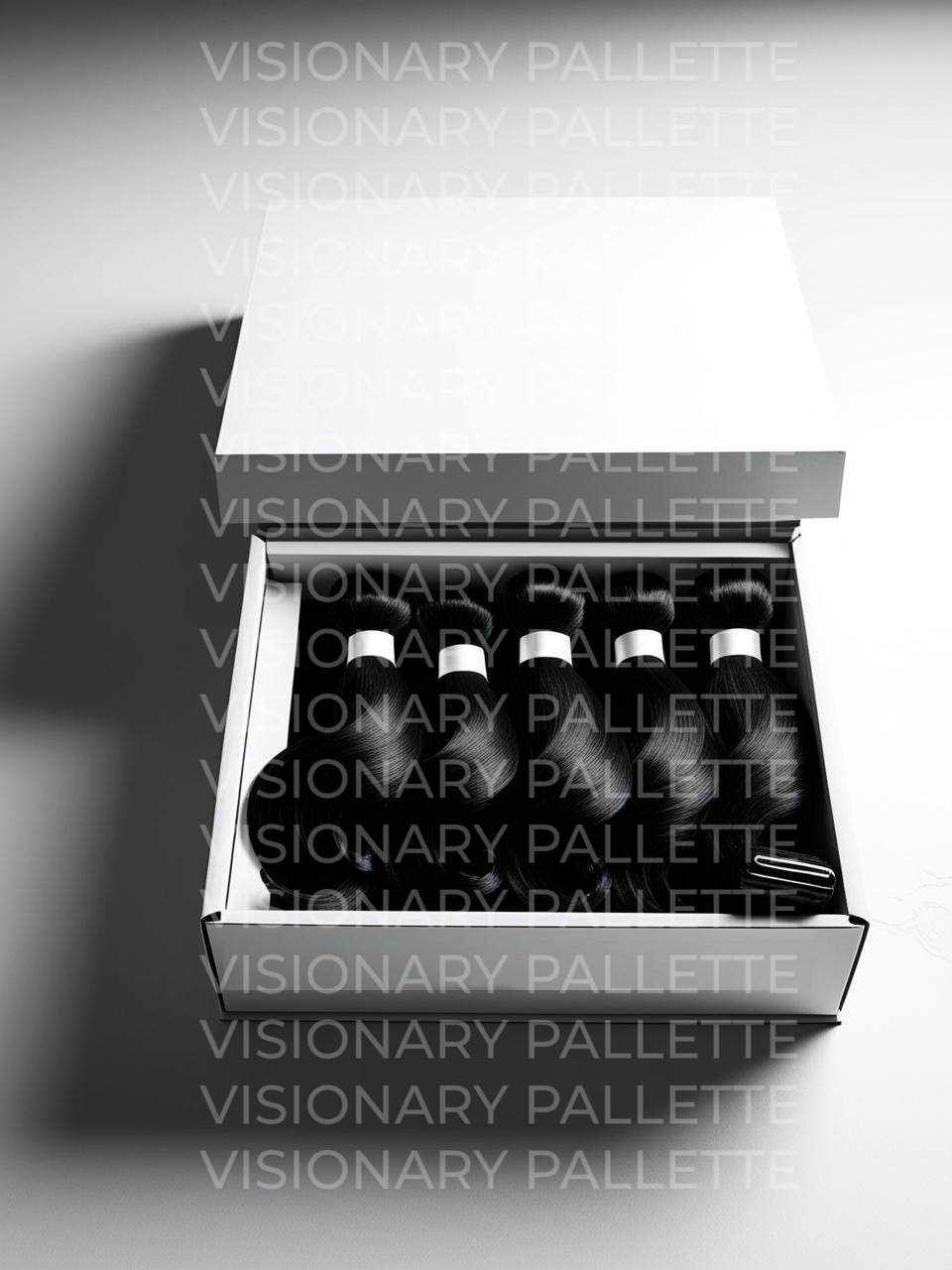 A realistic black and white Open subscription box with realistic black Straight hair bundles inside