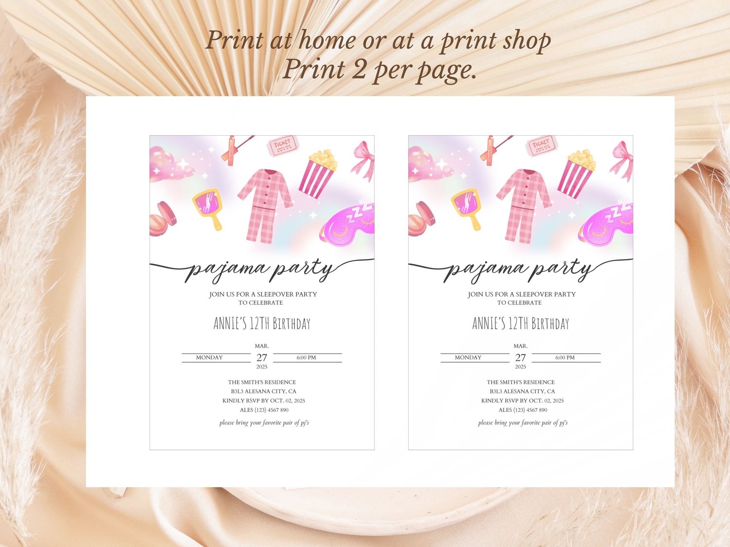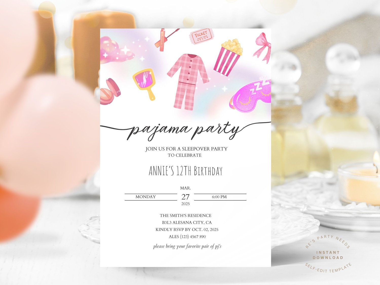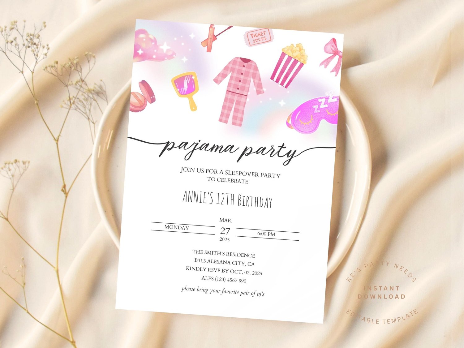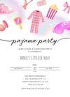 Editable Pizza and Pajamas Birthday Invitation, Sleepover Birthday Invitation, Slumber Party, Pajama Party, Movie Night Party Girl Pink