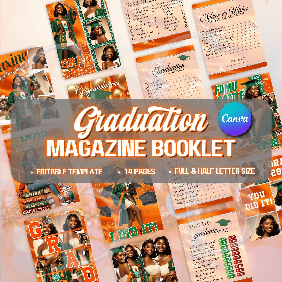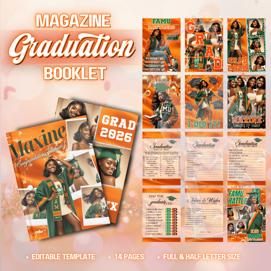 Make their graduation feel like a headline moment. This 14-page Graduation Magazine Booklet is designed to turn your celebration into a styled feature spread that is bold, vibrant, and completely personalized. The orange color story brings energy and warmth, while the structured magazine layout keeps everything polished and cohesive. It’s interactive. It’s memorable. And it feels thoughtfully designed from cover to final page.