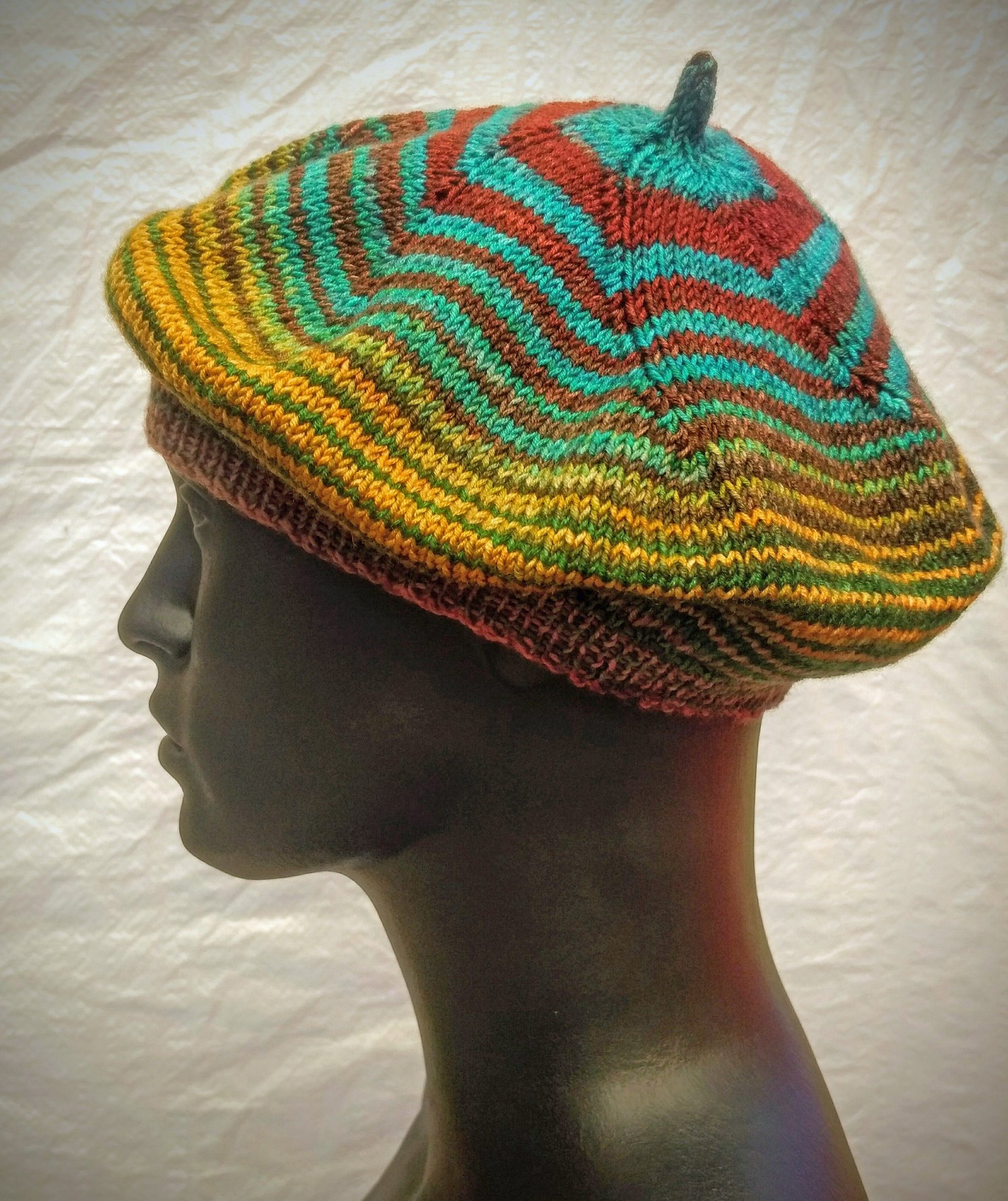 Beret: Circumference of band 51 cm / 20 in; Circumference of crown 76 cm / 30 in; Depth before point 19 cm / 7½ in