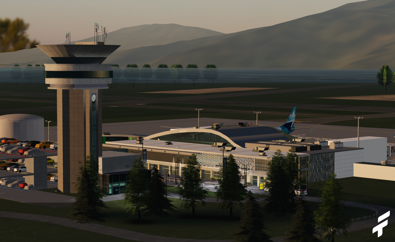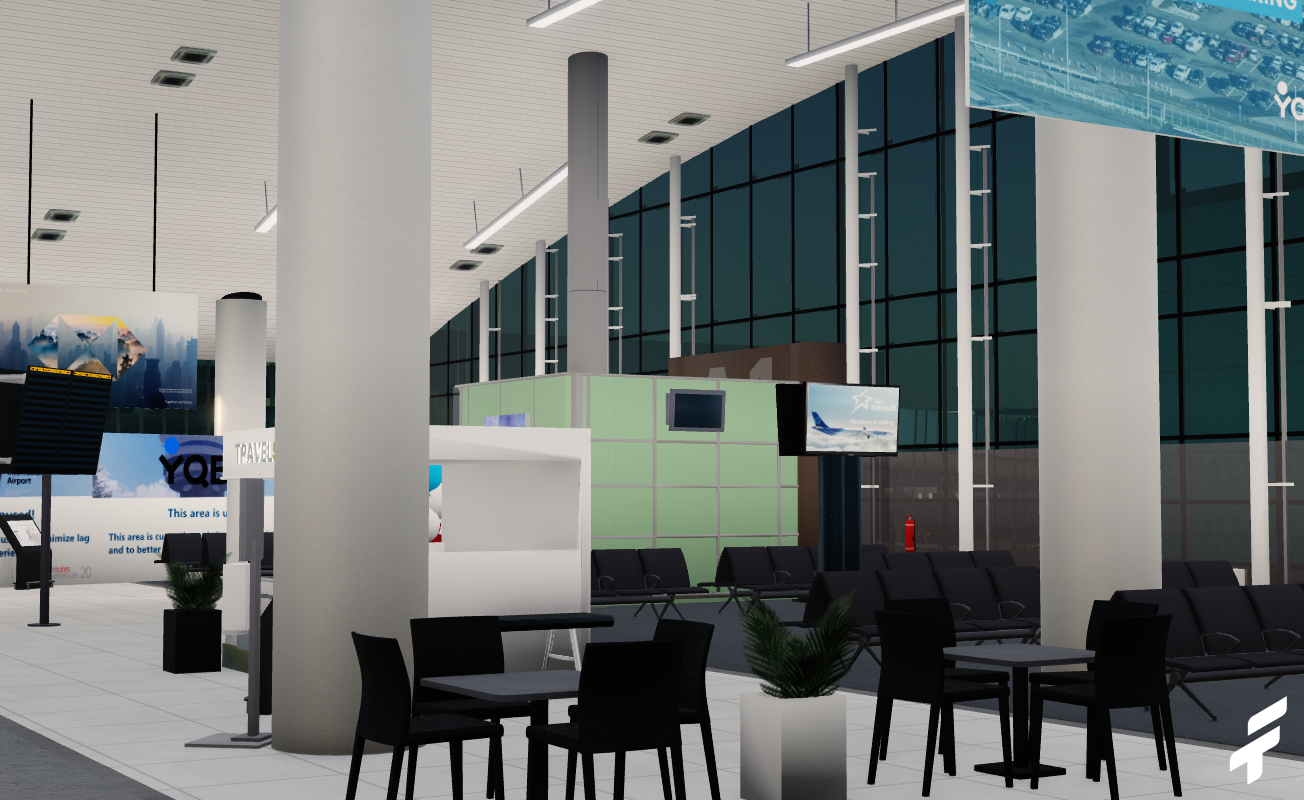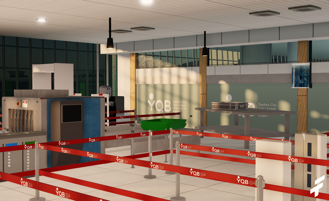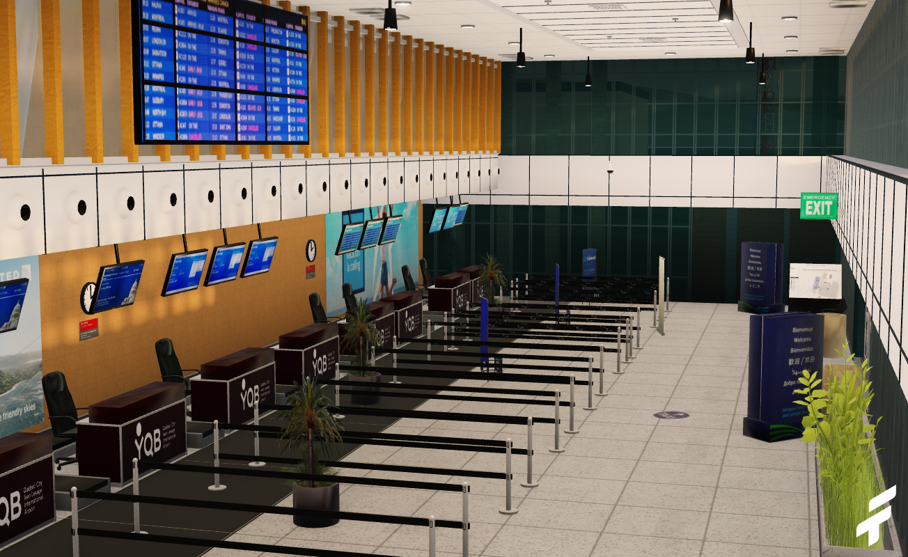 -Detailed interior with check-in, security, gate areas, airport stores, and a basic lounge.