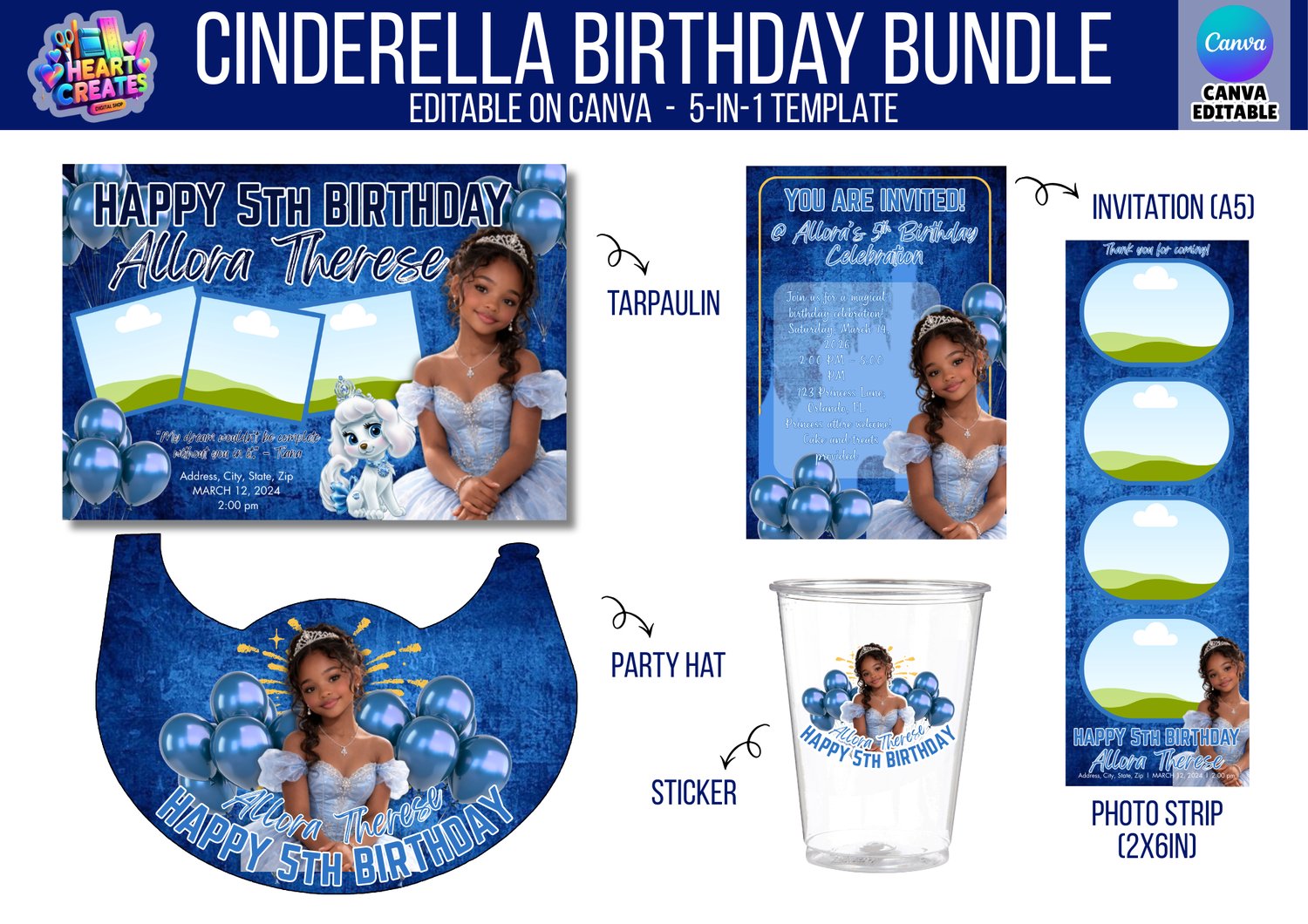 đź‘‘ Cinderella Birthday Bundle Template | Editable Canva Birthday Set | Princess Birthday Party Decorations | Blue Princess Party | Digital Download