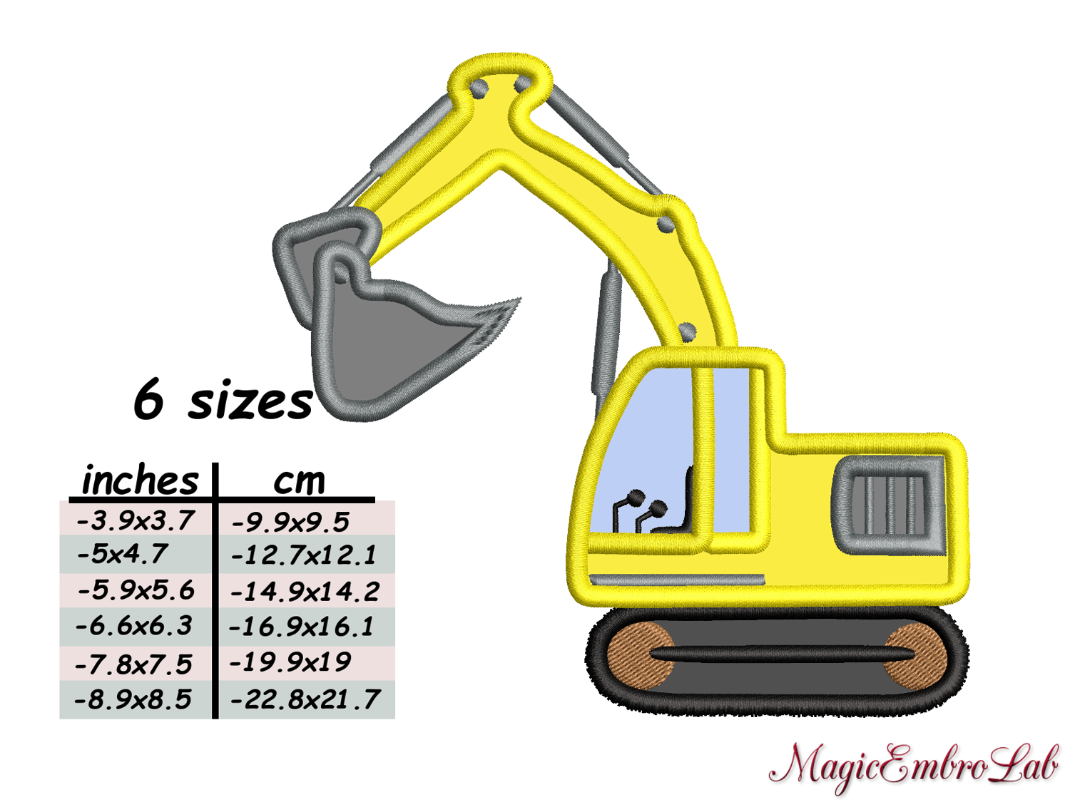 Excavator APPLIQUE, 6 sizes, Instant Download