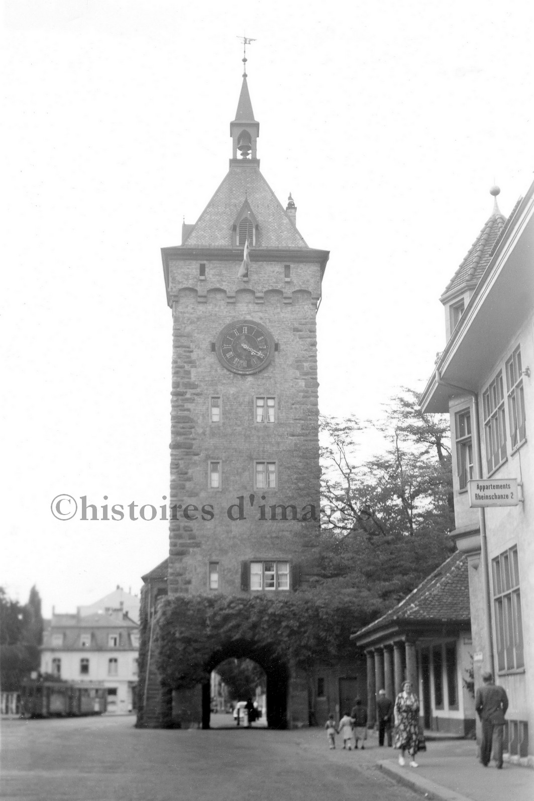 A rare vintage black and white photograph of Basel, Switzerland, taken in 1954. The image beautifully captures the historic clock tower and surrounding streets, with passersby evoking the charm of post-war European city life.