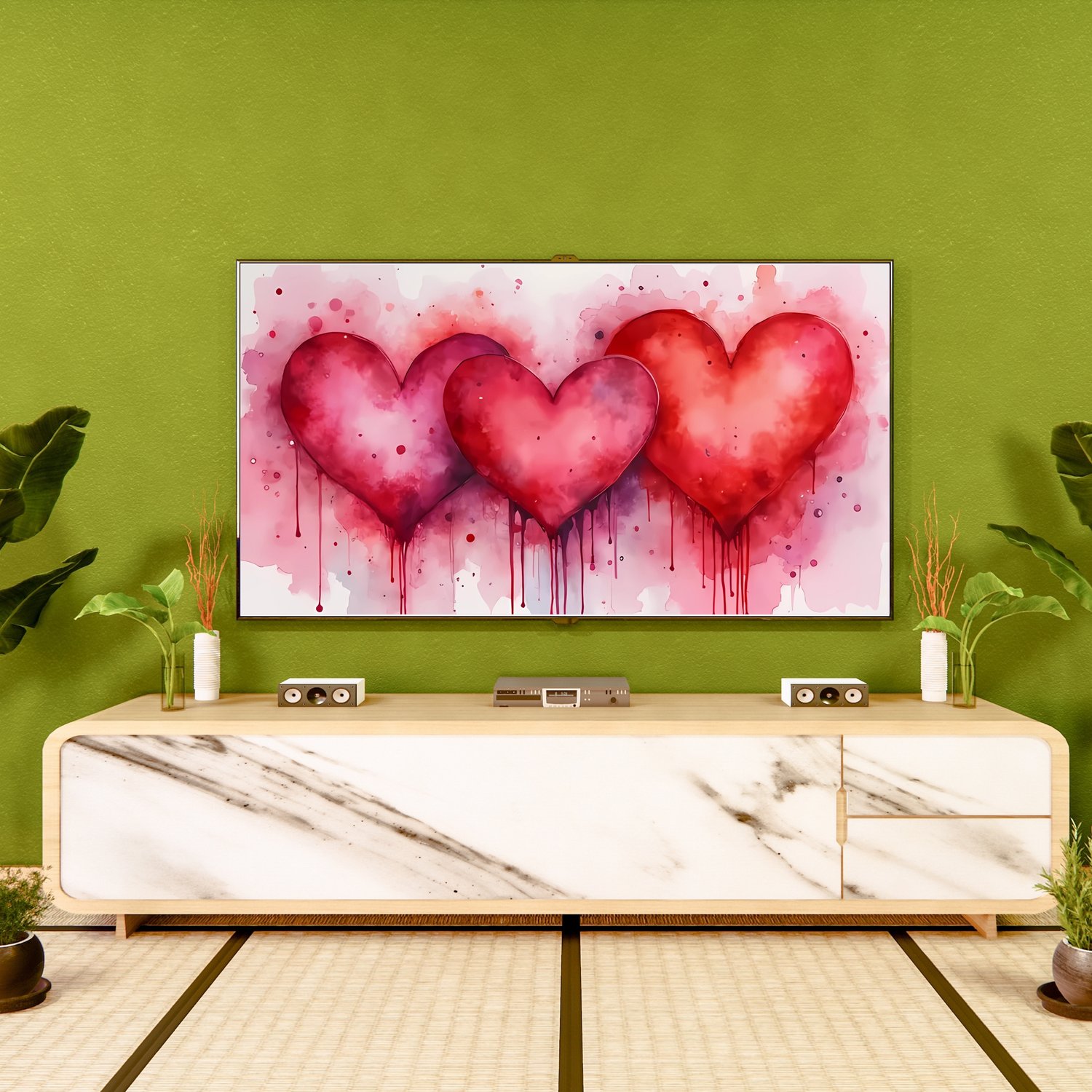 Valentine's Day Frame Tv Art, Valentine Pink and Red Watercolor Paint Art Hearts Frame Tv Art, Abstract Valentines Red Heart Download for Tv