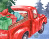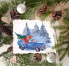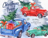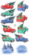 Xmas colorful trucks. Christmas Eve. Christmas, New Year, Boxing Day compositions. Winter forest backgrounds