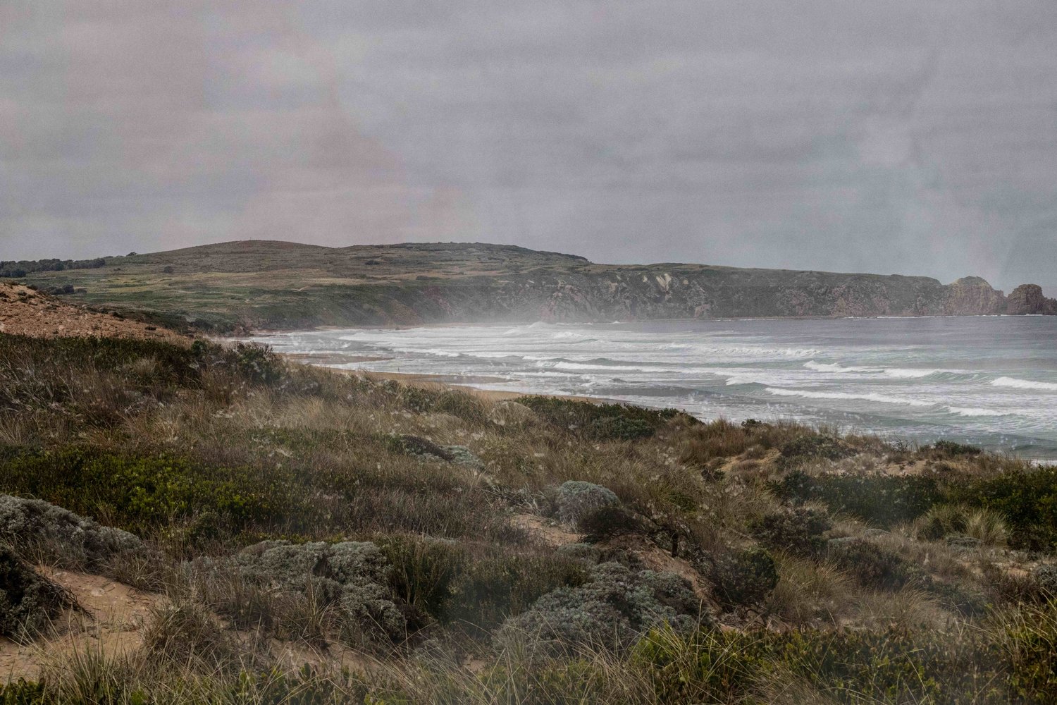 The day's light was fading, and the temperature was dropping as the waves grew larger, accompanied by a spray of ocean mist. This scene evokes a sense of melancholy yet possesses a unique beauty. It captures the raw power of the ocean. This image was taken on the back beaches of Phillip Island.