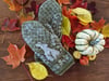 Mitten Lining: If you would like to work a lining, working your mittens a size larger than your hand and then working the lining a size smaller usually works for most people. You may pick up sts from the inside of the mitten (after ribbing) and work the chart in a single colour or work lining separately and sew in. For my sample, I used BFL/Masham and worked the lining separately from the mitten and increased the length of the rib and decreased the top every other round instead of every round.