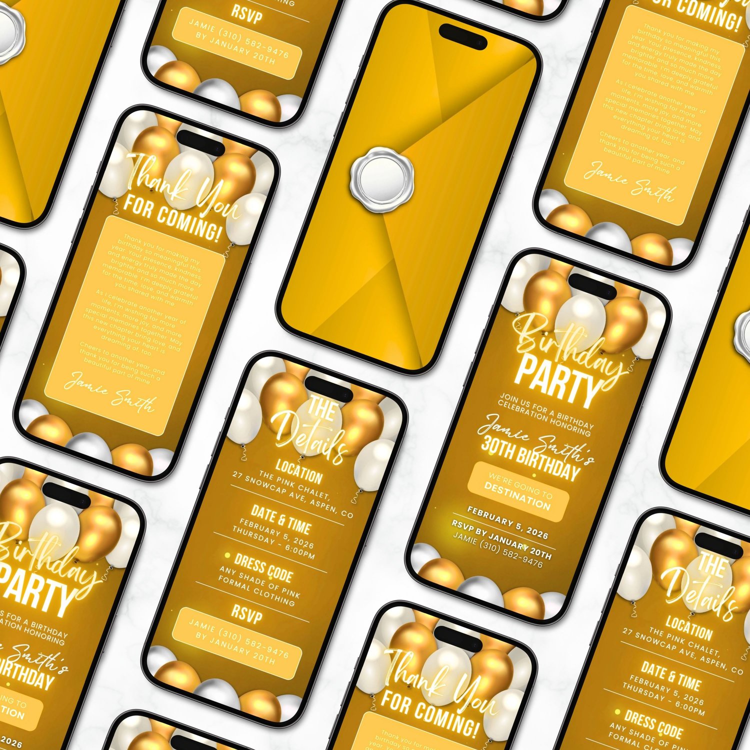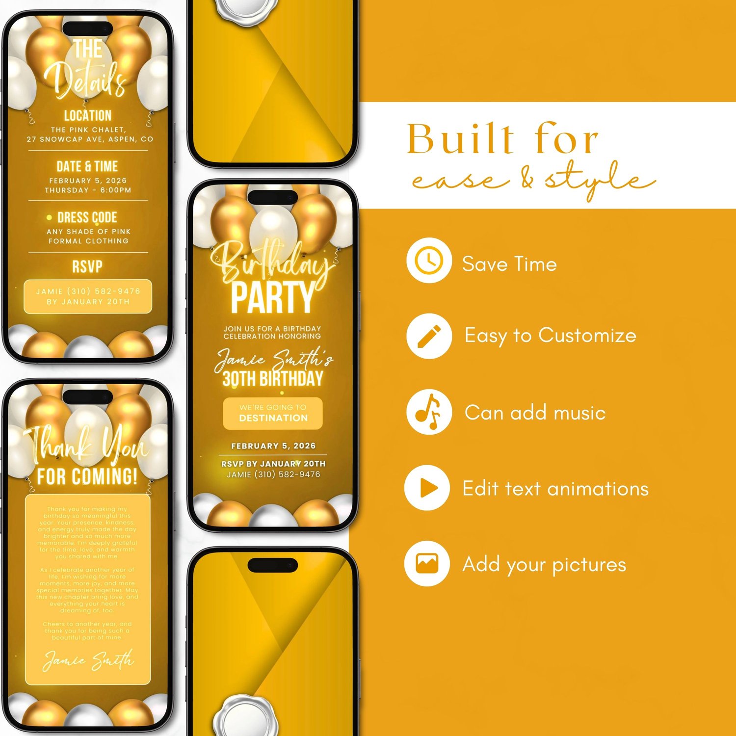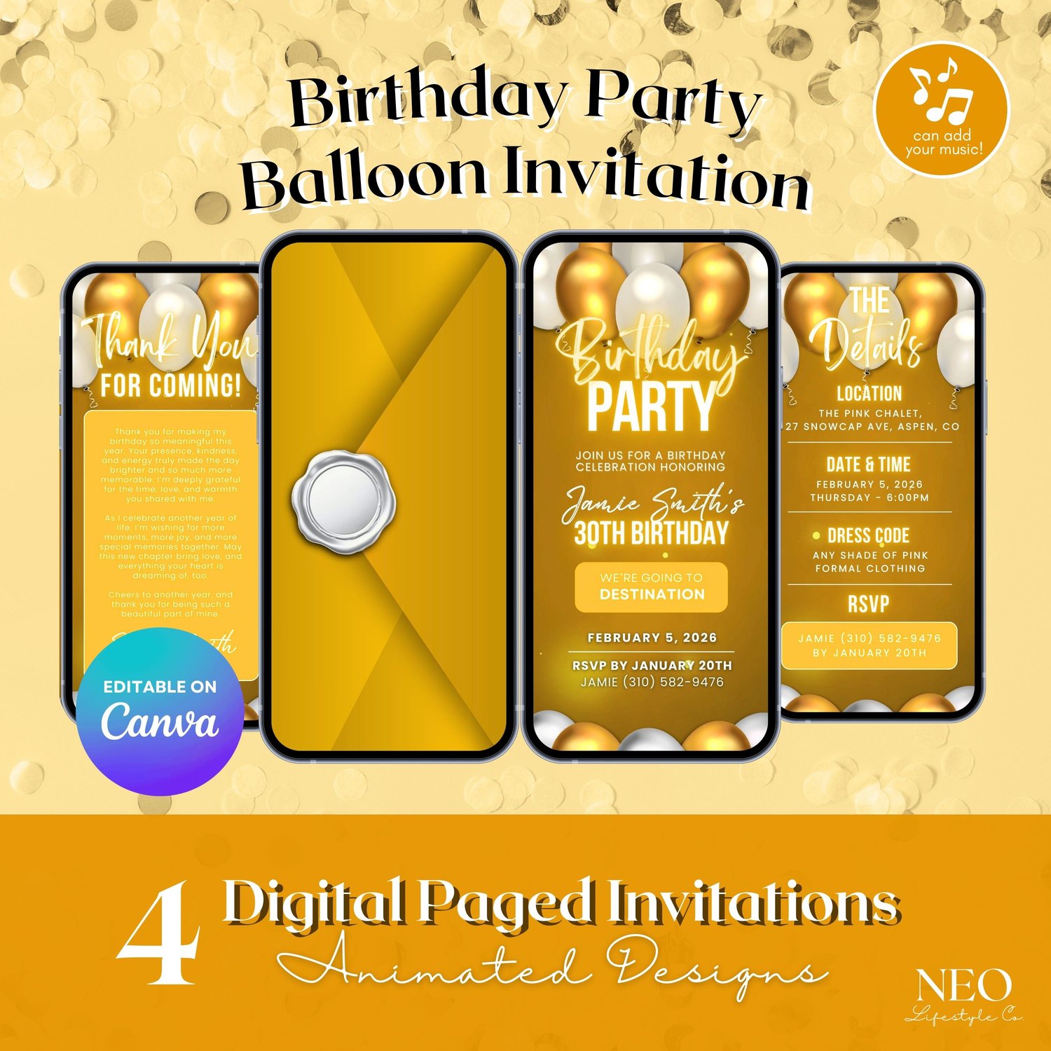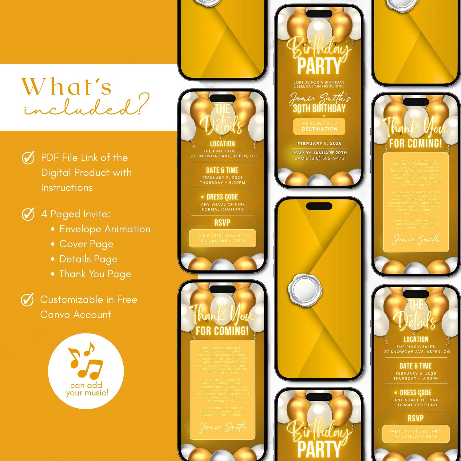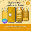 Yellow Birthday Party Invitation, Gold Birthday Balloon Invite for Milestone Celebrations, Kids Party Evite (Animated Canva Template)