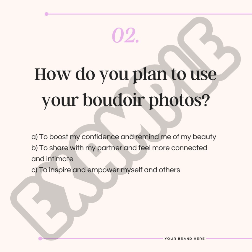 So, what can you expect from the Boudoir Session Goals Quiz? This engaging quiz will prompt your audience to answer a series of questions that reveal their innermost desires and preferences for their boudoir session. With fun and flirty prompts, your followers will be eager to share their results and spread the word about your business. Plus, you'll gain valuable insights into your audience's preferences, which can help you tailor your services and marketing strategies.