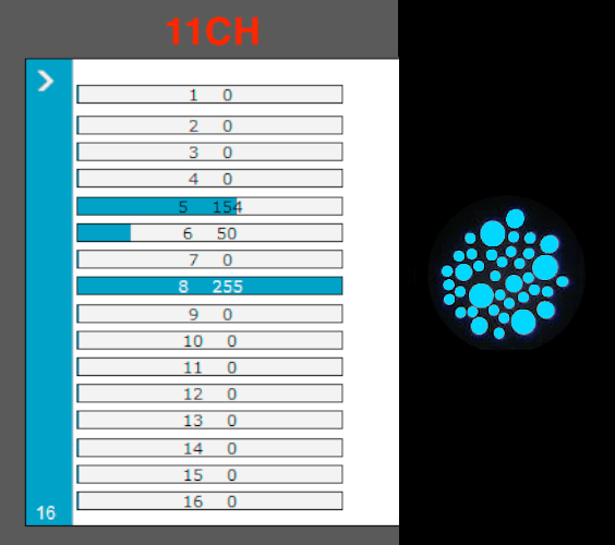 * Verifique que coincidan estos canales: 8 Dimmer, 5 en el valor 154 = Color Celeste, 6 en el valor 50 = Gobo de Burbujas (ver tercer foto).