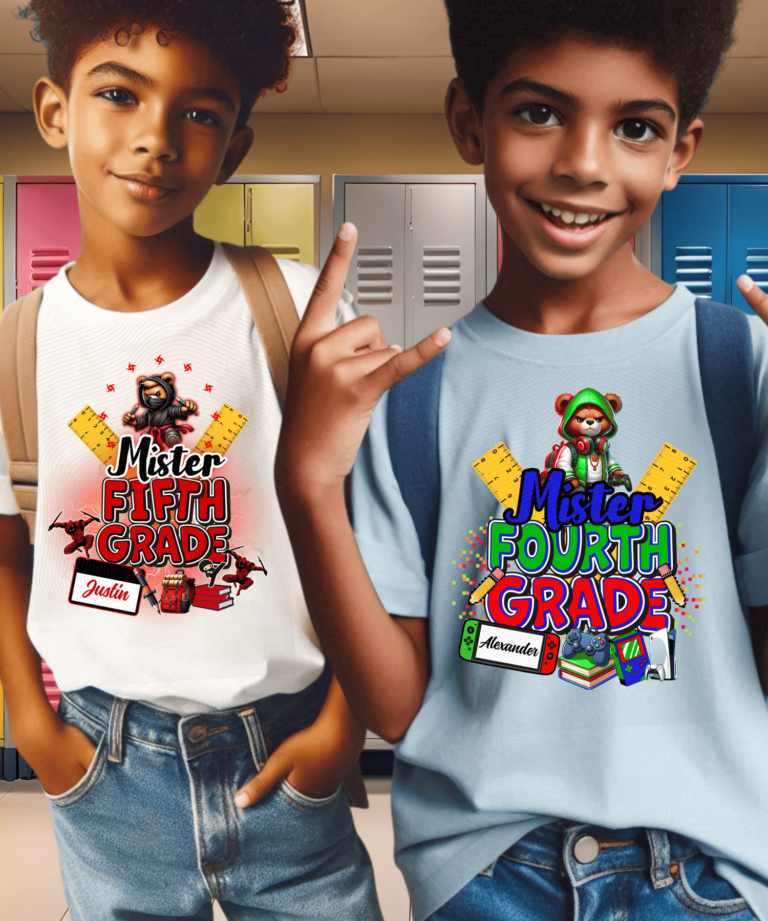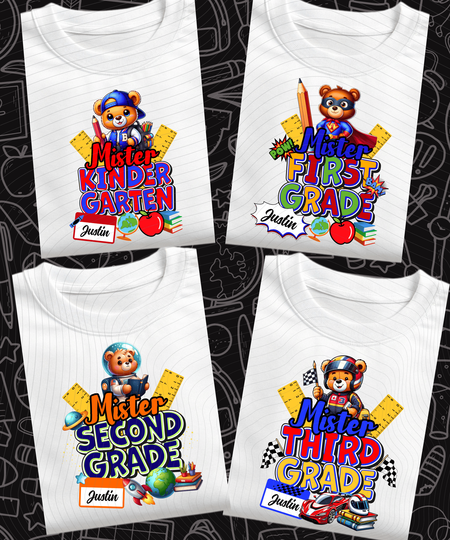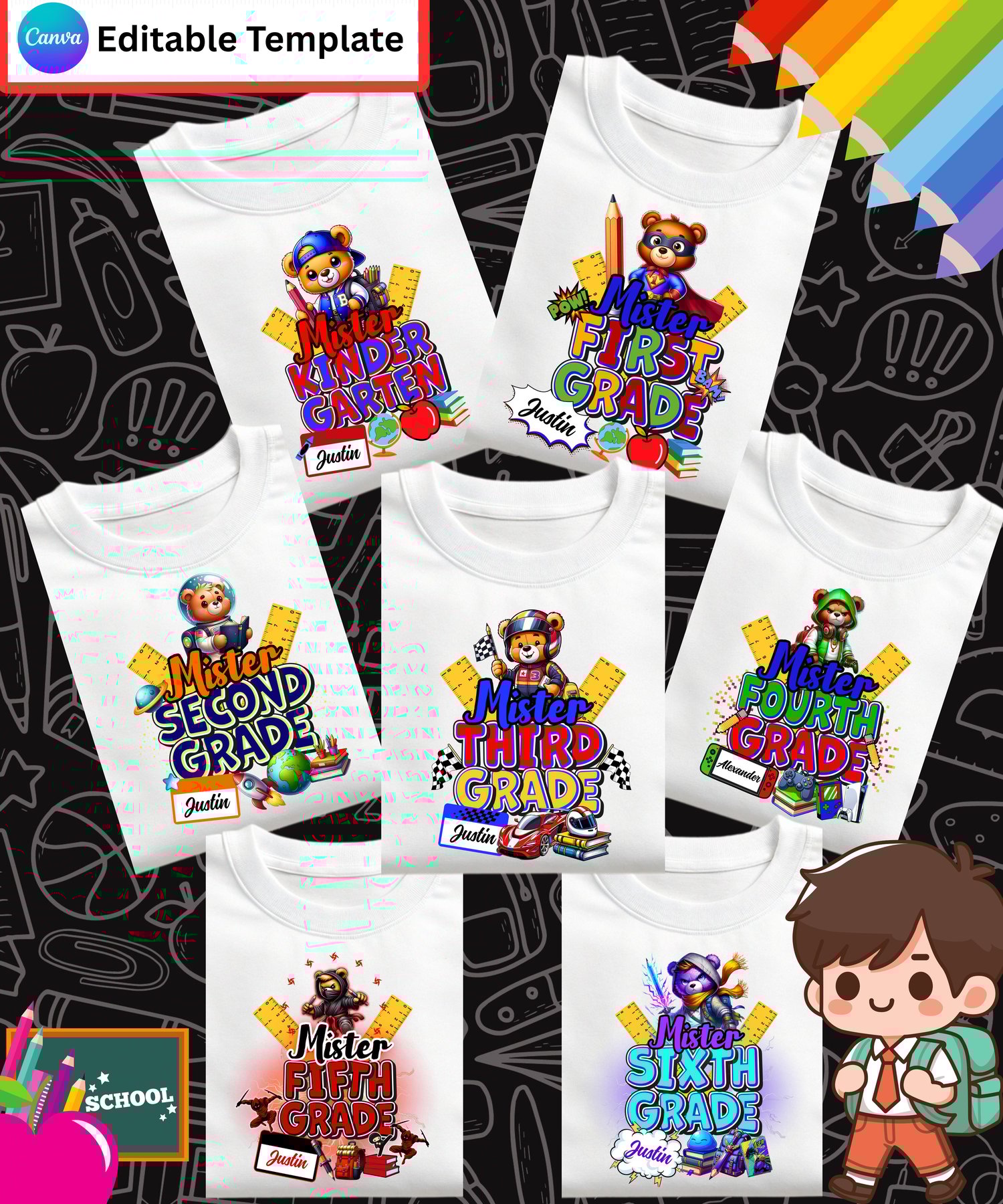 Drop heat all the way from Kindergarten to Sixth Grade with this editable Mister Tshirt Bundle! Each design features a different themed bear—from astronaut to ninja to anime hero—made for boys who want to show up fresh on day one.