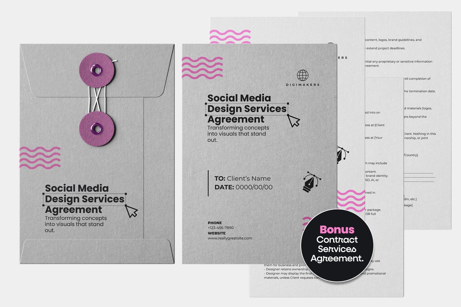 - 1 Business proposal with 9 pages + Bonus 1 Social Media Design Services Agreement with 3 pages easy customizable templates in PSD and Canva format.