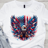 Show your patriotic spirit with this powerful 'American Eagle' t-shirt! This striking design features a majestic bald eagle with wings spread wide, adorned with the vibrant red, white, and blue of the American flag. Splashes of paint in patriotic colors add a dynamic touch.