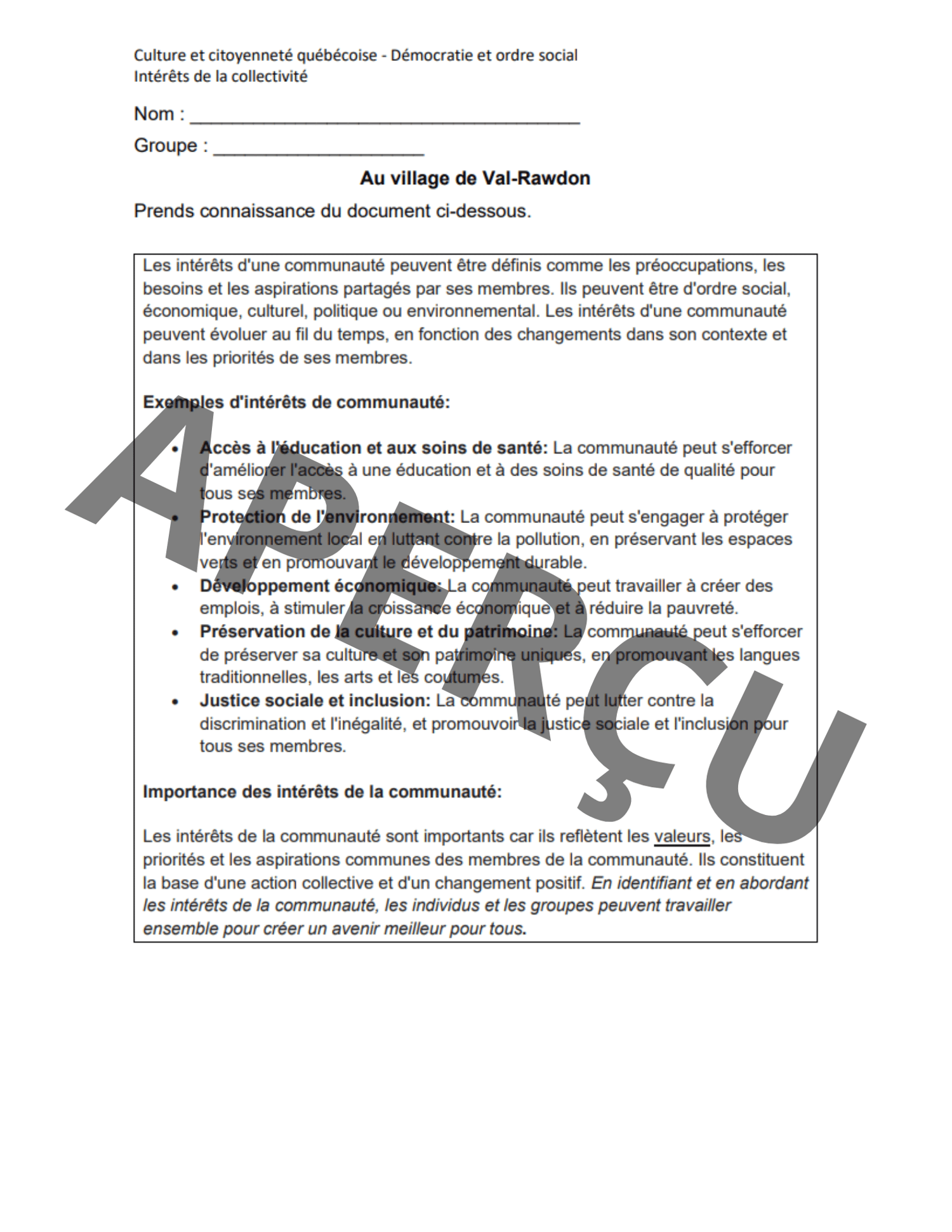 Permet aux élèves de développer leurs connaissances sur les intérêts de la collectivité. Pour des élèves de secondaire 2